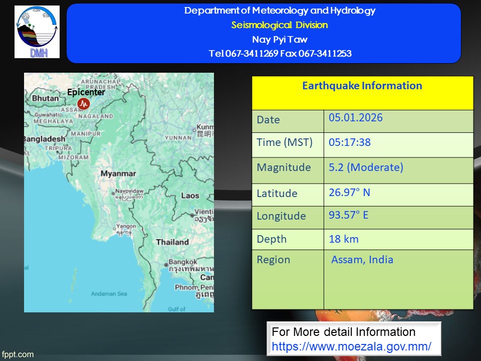 ၂၀၂၆ ခုနှစ်၊ ဇန်နဝါရီလ ၅ ရက်နေ့၊ မြန်မာစံတော်ချိန် (၀၅) နာရီ(၁၇) မိနစ်(၃၈) စက္ကန့် အချိန်တွင် နေပြည်တော်မြေငလျင်စခန်းမှ အနောက်မြောက်ဘက် (၅၂၁) မိုင်ခန့်ကွာဝေးသော မြန်မာနိုင်ငံ ပြည်ပ (Assam, India)၊ မြောက်လတ္တီတွဒ် (၂၆.၉၇) ဒီဂရီ၊ အရှေ့လောင်ဂျီတွဒ် (၉၃.၅၇) ဒီဂရီ၊ အနက် (၁၈) ကီလိုမီတာခန့်ကို ဗဟိုပြု၍ အင်အား ရစ်(ခ်)တာစကေး (၅.၂) အဆင့်ရှိ အင်အား အသင့်အတင့်ရှိသော မြေငလျင်တစ်ခု လှုပ်ရှားသွားကြောင်း တိုင်းထွာရရှိပါသည်။