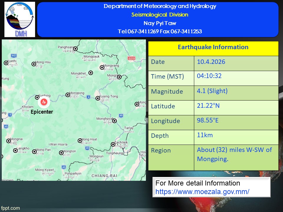 ၂၀၂၆ ခုနှစ်၊ ဧပြီလ ၁၀ ရက်နေ့၊ မြန်မာစံတော်ချိန် (၀၄)နာရီ၊ (၁၀)မိနစ်၊ (၃၂) စက္ကန့် အချိန် တွင် ကျိုင်းတုံမြေငလျင်စခန်းမှ အနောက်ဘက် (၆၇) မိုင် ခန့်ကွာဝေးသော မြန်မာနိုင်ငံပြည်တွင်း (မိုင်းပြင်းမြို့၏ အနောက်-အနောက်တောင်ဘက် (၃၂) မိုင် ခန့်အကွာ)၊ မြောက်လတ္တီတွဒ် (၂၁.၂၂) ဒီဂရီ၊ အရှေ့လောင်ဂျီတွဒ် (၉၈.၅၅) ဒီဂရီ၊ အနက် (၁၁) ကီလိုမီတာကို ဗဟိုပြု၍ ပမာဏ ၄.၁(M) အဆင့်ရှိ အင်အားအနည်းငယ်ရှိသော မြေငလျင်တစ်ခု လှုပ်ရှားသွားကြောင်း တိုင်းထွာရရှိပါသည်။