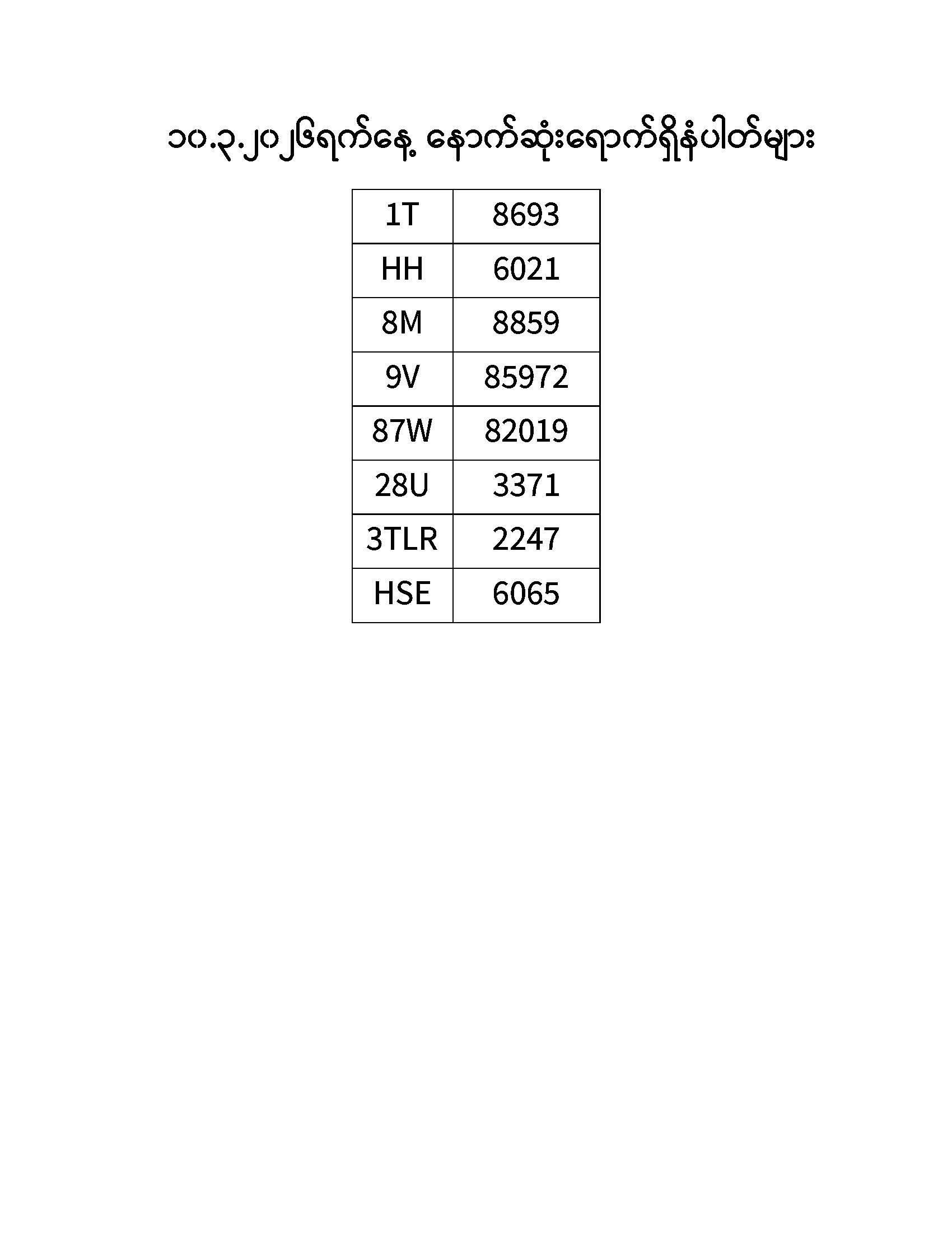 ၁၀.၃.၂၀၂၆ ရက်နေ့ထိ နောက်ဆုံးရောက်ရှိ နံပါတ်များ Published: 11 Mar, 2026 Place: ကုန်းလမ်းပို့ဆောင်ရေးညွှန်ကြားမှုဦးစီးဌာန
