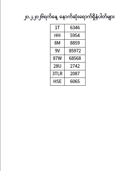 ၂၀.၂.၂၀၂၆ ရက်နေ့ထိ နောက်ဆုံးရောက်ရှိ နံပါတ်များ