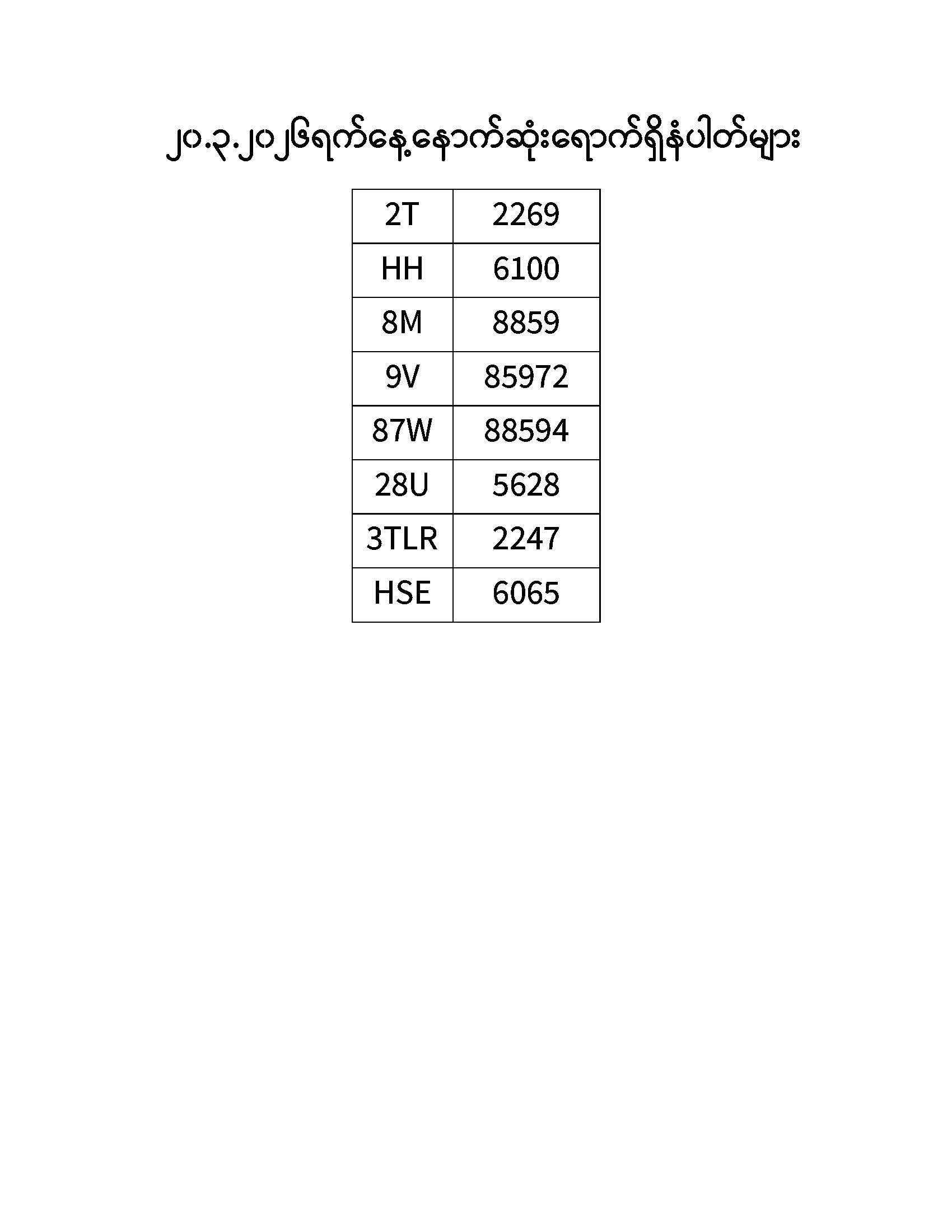၂၀.၃.၂၀၂၆ ရက်နေ့ထိ နောက်ဆုံးရောက်ရှိ နံပါတ်များ Published: 23 Mar, 2026 Place: ကုန်းလမ်းပို့ဆောင်ရေးညွှန်ကြားမှုဦးစီးဌာန