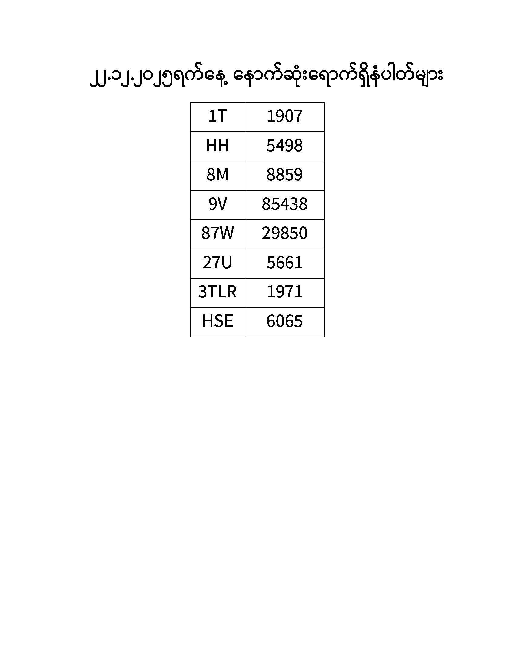 ၂၂.၁၂.၂၀၂၅ ရက်နေ့ထိ နောက်ဆုံးရောက်ရှိ နံပါတ်များ Published: 23 Dec, 2025 Place: ကုန်းလမ်းပို့ဆောင်ရေးညွှန်ကြားမှုဦးစီးဌာန