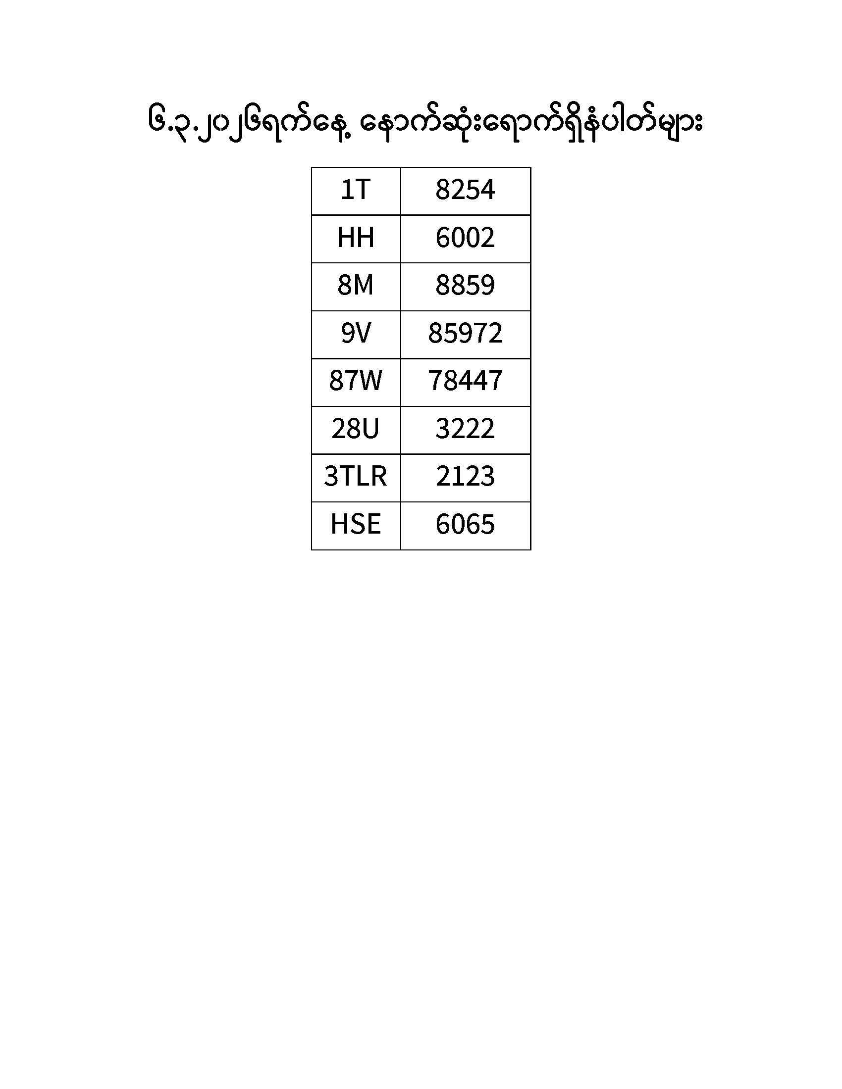 ၆.၃.၂၀၂၆ ရက်နေ့ထိ နောက်ဆုံးရောက်ရှိ နံပါတ်များ