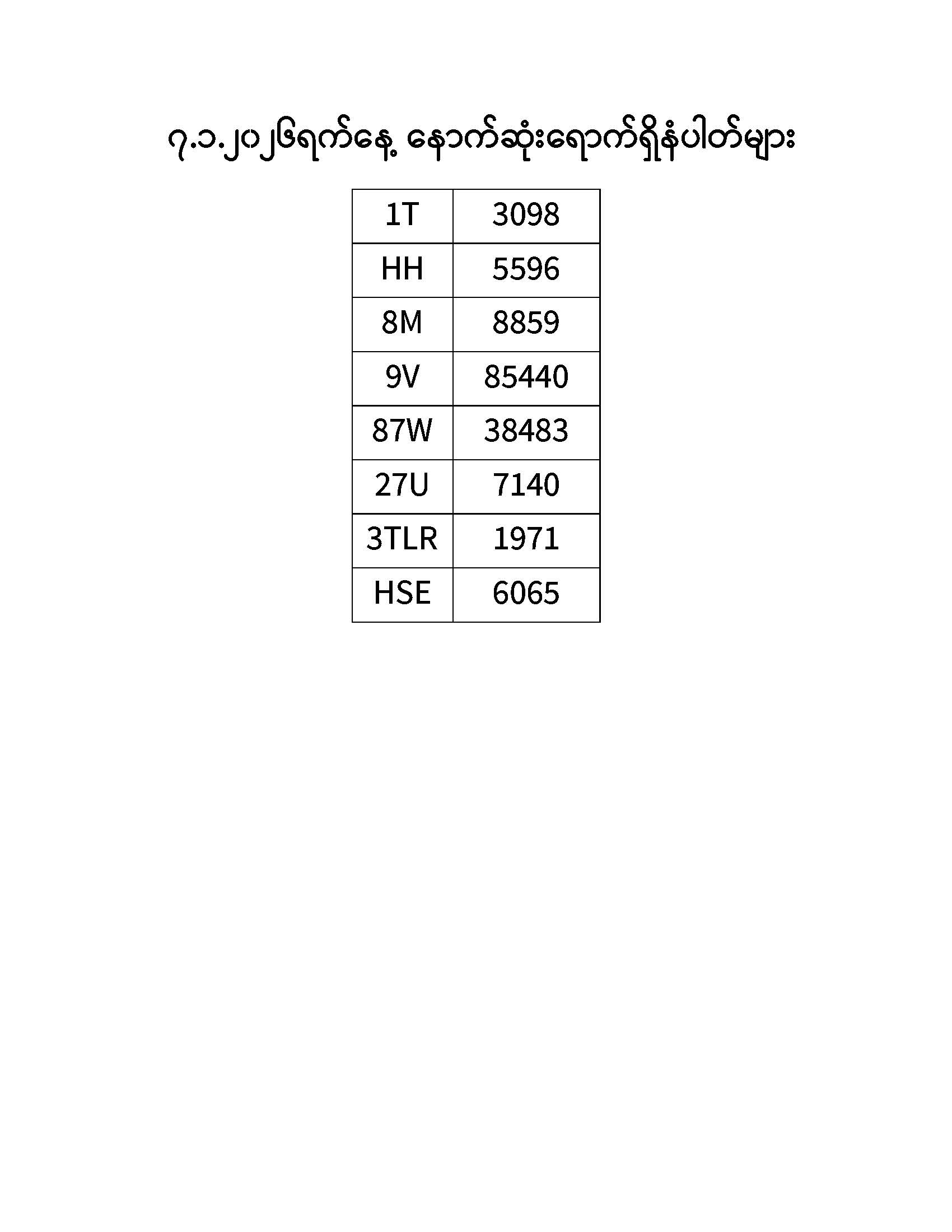 ၇.၁.၂၀၂၆ ရက်နေ့ထိ နောက်ဆုံးရောက်ရှိ နံပါတ်များ Published: 08 Jan, 2026 Place: ကုန်းလမ်းပို့ဆောင်ရေးညွှန်ကြားမှုဦးစီးဌာန