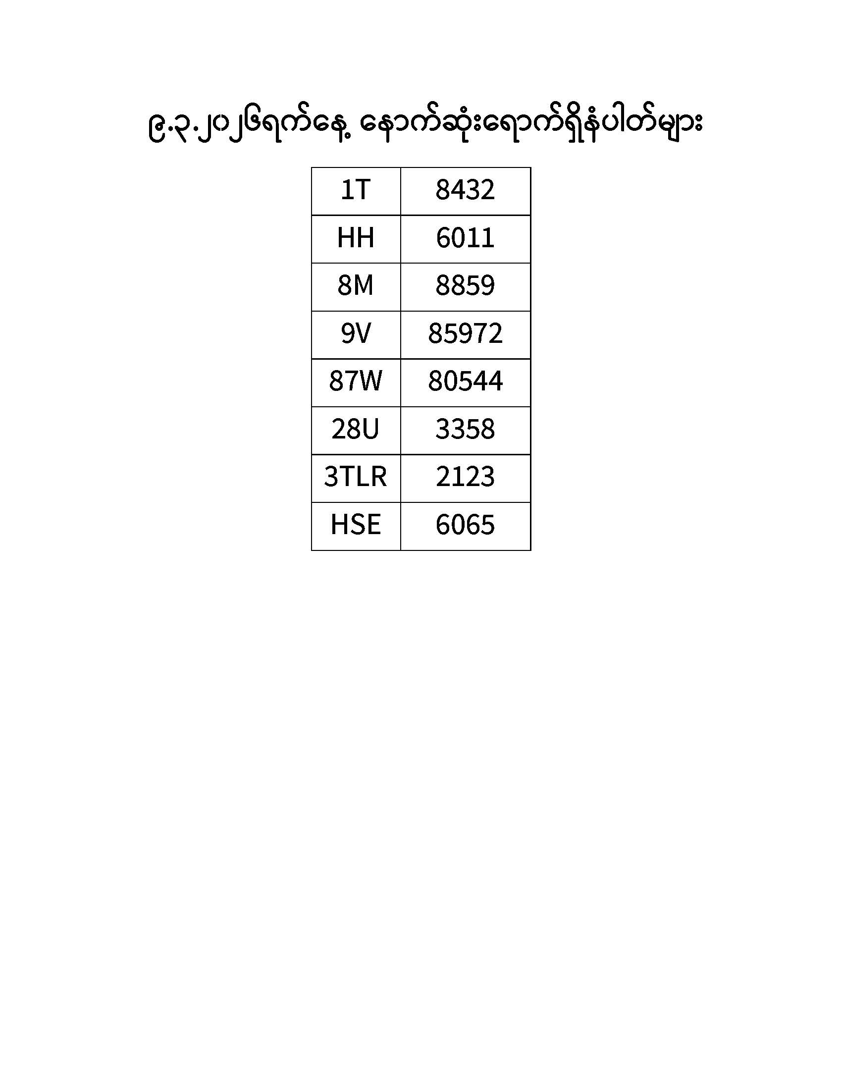 ၉.၃.၂၀၂၆ ရက်နေ့ထိ နောက်ဆုံးရောက်ရှိ နံပါတ်များ