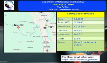 မြေငလျင်သတင်း၂၀၂၆ ခုနှစ် ၊ ဖေဖော်ဝါရီလ ၊ ( ၅ ) ရက်
