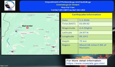 မြေငလျင်သတင်း၂၀၂၆ ခုနှစ် ၊ ဖေဖော်ဝါရီလ ၊ ( ၄ ) ရက်