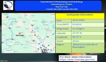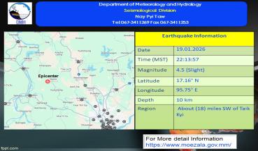 မြေငလျင်သတင်း၂၀၂၆ ခုနှစ် ၊ ဇန်နဝါရီလ ၊ ( ၁၉ ) ရက်