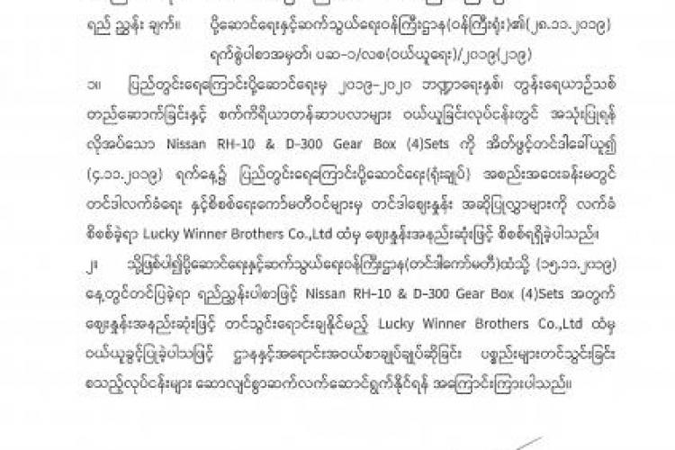ပြည်တွင်းရေကြောင်းပို့ဆောင်ရေးမှ 10 Ton Forklift (Japan) (၂) စီးကို ဝယ်ယူရန် Winning Way Co., Ltd မှ တင်ဒါ အောင်မြင်ကြောင်း ကြေညာခြင်း။ပြည်တွင်းရေကြောင်းပို့ဆောင်ရေး