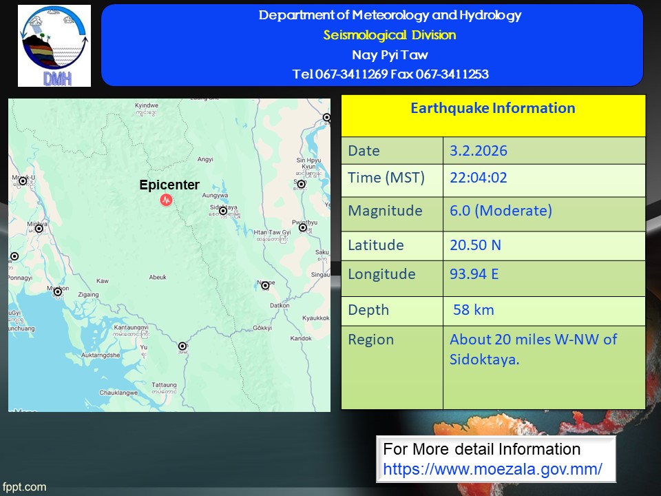 ၂၀၂၆ ခုနှစ်၊ ဖေဖော်ဝါရီလ ၃ ရက်နေ့၊ မြန်မာစံတော်ချိန် (၂၂) နာရီ၊ (၀၄) မိနစ်၊ (၀၂) စက္ကန့်အချိန်တွင် စစ်တွေမြေငလျင်စခန်းမှ အရှေ့-အရှေ့မြောက်ဘက် (၇၃) မိုင်ခန့်ကွာဝေးသော မြန်မာနိုင်ငံ ပြည်တွင်း (စေတုတ္တရာမြို့၏ အနောက်-အနောက်မြောက်ဘက် မိုင် (၂၀) ခန့်အကွာ)၊ မြောက်လတ္တီတွဒ် (၂၀.၅၀) ဒီဂရီ၊ အရှေ့လောင်ဂျီတွဒ် (၉၃.၉၄) ဒီဂရီ၊ အနက် (၅၈) ကီလိုမီတာကို ဗဟိုပြု၍ အင်အား ရစ်(ခ်)တာစကေး (၆.၀) အဆင့်ရှိ အင်အားအသင့်အတင့်ရှိသော မြေငလျင် တစ်ခု လှုပ်ရှားသွားကြောင်း တိုင်းထွာရရှိပါသည်။