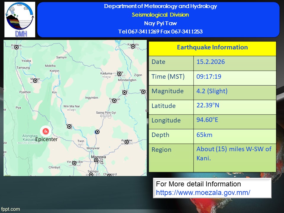 ၂၀၂၆ ခုနှစ်၊ ဖေဖော်ဝါရီလ ၁၅ ရက်နေ့၊ မြန်မာစံတော်ချိန် (၀၉)နာရီ၊ (၁၇)မိနစ်၊ (၁၉) စက္ကန့်အချိန်တွင် ကန့်ဘလူမြေငလျင်စခန်းမှ အနောက်တောင်ဘက် မိုင်(၈၀) ခန့်ကွာဝေးသော မြန်မာနိုင်ငံပြည်တွင်း (ကနီမြို့၏ အနောက်-အနောက်တောင်ဘက် (၁၅) မိုင်ခန့်အကွာ) မြောက် လတ္တီတွဒ် (၂၂.၃၉) ဒီဂရီ၊ အရှေ့လောင်ဂျီတွဒ် (၉၄.၆၀) ဒီဂရီ၊ အနက် (၆၅) ကီလိုမီတာကို ဗဟိုပြု၍ အင်အားရစ်(ခ်)တာစကေး (၄.၂) အဆင့်ရှိ အင်အားအနည်းငယ်ရှိသော မြေငလျင်တစ်ခု လှုပ်ရှားသွားကြောင်း တိုင်းထွာရရှိပါသည်။