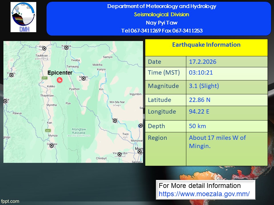 ၂၀၂၆ ခုနှစ်၊ ဖေဖော်ဝါရီလ ၁၇ ရက်နေ့၊ မြန်မာစံတော်ချိန် (၀၃)နာရီ၊ (၁၀)မိနစ်၊ (၂၁)စက္ကန့် အချိန်တွင် ကန့်ဘလူမြေငလျင်စခန်းမှ အနောက်တောင်ဘက် (၈၅) မိုင်ခန့် ကွာဝေးသော မြန်မာနိုင်ငံပြည်တွင်း (မင်းကင်းမြို့၏ အနောက်ဘက် (၁၇) မိုင်ခန့်အကွာ)၊ မြောက်လတ္တီတွဒ် (၂၂.၈၆) ဒီဂရီ၊ အရှေ့လောင်ဂျီတွဒ် (၉၄.၂၂) ဒီဂရီ၊ အနက် (၅၀) ကီလိုမီတာကို ဗဟိုပြု၍ အင်အားရစ်(ခ်)တာစကေး (၃.၁)အဆင့်ရှိ အင်အားအနည်းငယ်ရှိသော မြေငလျင်တစ်ခု လှုပ်ရှား သွားကြောင်း တိုင်းထွာရရှိပါသည်။