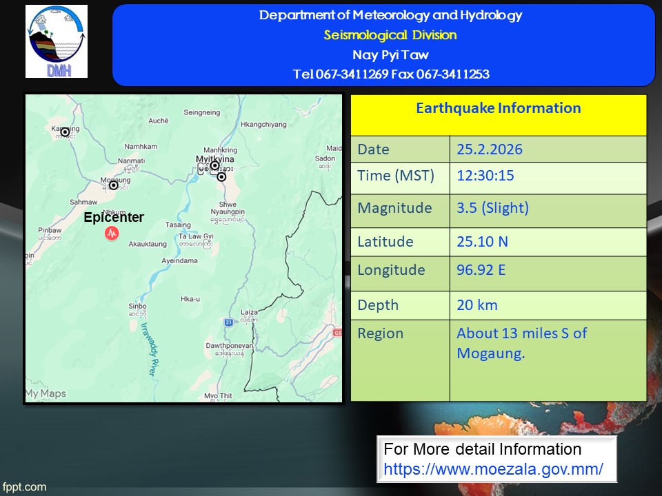 ၂၀၂၆ ခုနှစ်၊ ဖေဖော်ဝါရီလ ၂၅ ရက်နေ့၊ မြန်မာစံတော်ချိန် (၁၂)နာရီ၊ (၃၀)မိနစ်၊ (၁၅)စက္ကန့် အချိန်တွင် မြစ်ကြီးနားမြေငလျင်စခန်းမှ အနောက်တောင်ဘက် (၃၅) မိုင်ခန့် ကွာဝေးသော မြန်မာနိုင်ငံပြည်တွင်း (မိုးကောင်းမြို့၏ တောင်ဘက် (၁၃) မိုင်ခန့်အကွာ)၊ မြောက်လတ္တီတွဒ် (၂၅.၁၀) ဒီဂရီ၊ အရှေ့လောင်ဂျီတွဒ် (၉၆.၉၂) ဒီဂရီ၊ အနက် (၂၀) ကီလိုမီတာကို ဗဟိုပြု၍ အင်အားပမာဏ (၃.၅)အဆင့်ရှိ အင်အားအနည်းငယ်ရှိသော မြေငလျင်တစ်ခု လှုပ်ရှားသွားကြောင်း တိုင်းထွာရရှိပါသည်။