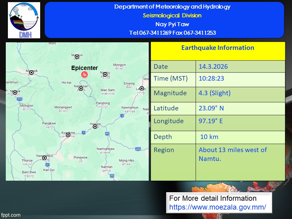 ၂၀၂၆ ခုနှစ်၊ မတ်လ ၁၄ ရက်နေ့၊ မြန်မာစံတော်ချိန် (၁၀) နာရီ၊ (၂၈) မိနစ်၊ (၂၃) စက္ကန့် အချိန်တွင် သီပေါမြေငလျင်စခန်းမှ မြောက်-အနောက်မြောက်ဘက် (၃၃) မိုင်ခန့်ကွာဝေးသော မြန်မာနိုင်ငံ ပြည်တွင်း (နမ္မတူမြို့၏ အနောက်ဘက် (၁၃) မိုင်ခန့်အကွာ)၊ မြောက်လတ္တီတွဒ် (၂၃.၀၉) ဒီဂရီ၊ အရှေ့လောင်ဂျီတွဒ် (၉၇.၁၉) ဒီဂရီ၊ အနက် (၁၀) ကီလိုမီတာကို ဗဟိုပြု၍ အင်အား ပမာဏ (၄.၃) အဆင့်ရှိ အင်အားအနည်းငယ်ရှိသော မြေငလျင်တစ်ခု လှုပ်ရှား သွားကြောင်း တိုင်းထွာရရှိပါသည်။