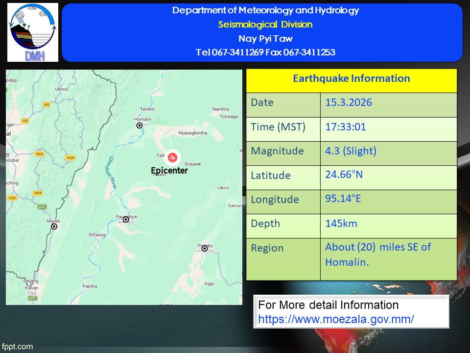 ၂၀၂၆ ခုနှစ်၊ မတ်လ ၁၅ ရက်နေ့၊ မြန်မာစံတော်ချိန် (၁၇)နာရီ၊ (၃၃)မိနစ်၊ (၀၁) စက္ကန့် အချိန်တွင် တမူးမြေငလျင်စခန်းမှ အရှေ့မြောက်ဘက် (၆၁) မိုင် ခန့်ကွာဝေးသော မြန်မာနိုင်ငံ ပြည်တွင်း (ဟုမ္မလင်းမြို့၏ အရှေ့တောင်ဘက် မိုင် (၂၀) ခန့်အကွာ)၊ မြောက်လတ္တီတွဒ် (၂၄.၆၆) ဒီဂရီ၊ အရှေ့လောင်ဂျီတွဒ် (၉၅.၁၄) ဒီဂရီ၊ အနက် (၁၄၅) ကီလိုမီတာကို ဗဟိုပြု၍ အင်အားပမာဏ (၄.၃) အဆင့်ရှိ အင်အားအနည်းငယ်ရှိသော မြေငလျင်တစ်ခု လှုပ်ရှားသွား ကြောင်း တိုင်းထွာရရှိပါသည်။