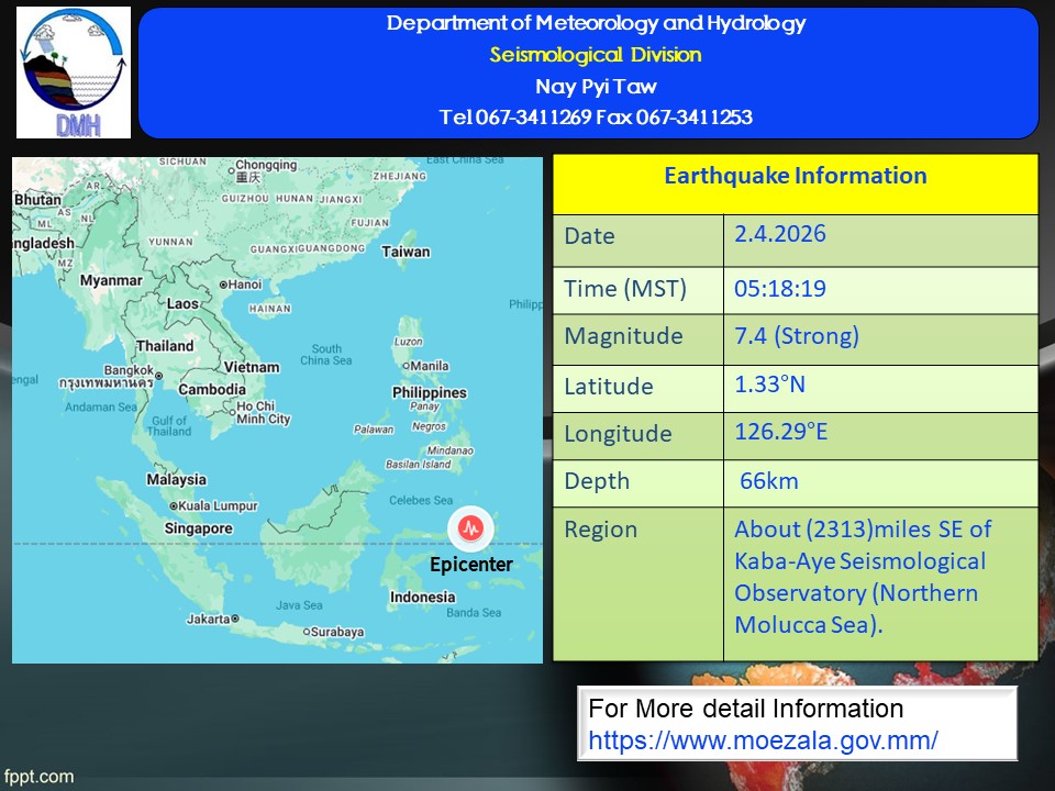 ၂၀၂၆ ခုနှစ်၊ ဧပြီလ ၂ ရက်နေ့၊ မြန်မာစံတော်ချိန် (၀၅) နာရီ၊ (၁၈) မိနစ်၊ (၁၉) စက္ကန့် အချိန်တွင် ကမ္ဘာအေးမြေငလျင်စခန်းမှ အရှေ့တောင်ဘက် (၂၃၁၃) မိုင်ခန့်ကွာဝေးသော မြန်မာနိုင်ငံ ပြည်ပ (Northern Molucca Sea)၊ မြောက်လတ္တီတွဒ် (၁.၃၃) ဒီဂရီ၊ အရှေ့ လောင်ဂျီတွဒ် (၁၂၆.၂၉) ဒီဂရီ၊ အနက် (၆၆) ကီလိုမီတာခန့်ကို ဗဟိုပြု၍ ပမာဏ ၇.၄ (M) အဆင့်ရှိ အင်အားပြင်းထန်သော မြေငလျင်တစ်ခု လှုပ်ရှားသွားကြောင်း တိုင်းထွာရရှိပါသည်။