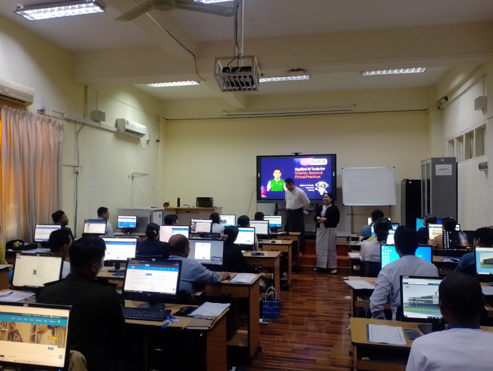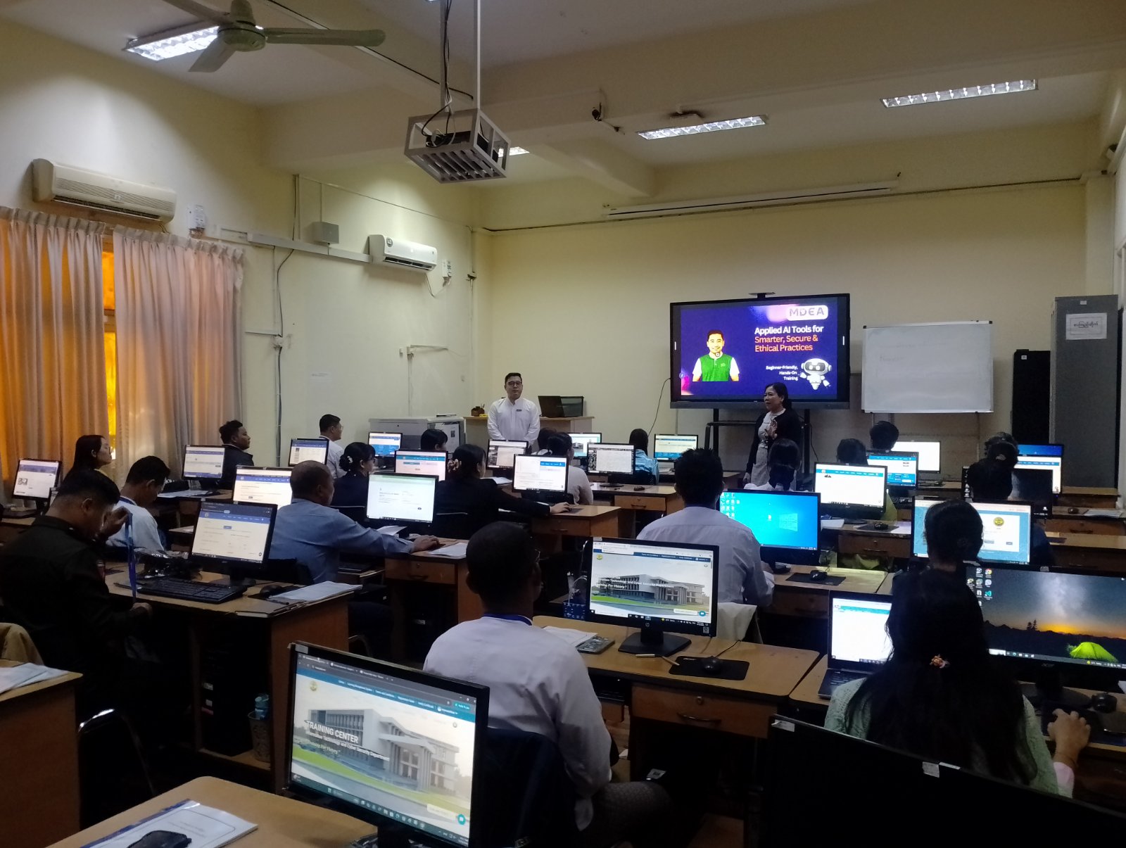 Applied AI Tools for Smarter, Secure and Ethical Practices သင်တန်းကို ဒီဂျစ်တယ်စီးပွားရေးဆိုင်ရာလုပ်ငန်းရှင်များအသင်း (MDEA) နှင့် သတင်းအချက်အလက် နည်းပညာနှင့် ဆိုက်ဘာလုံခြုံရေးသင်တန်းကျောင်း တို့ ပူးပေါင်း၍ ဖွင့်လှစ်ပို့ချခဲ့ခြင်းဖြစ်ကြောင်း သိရှိရပါသည်။ သင်တန်းတွင် ChatGPT၊ Gemini၊ Copilot၊ Notion AI၊ Canva AI စသည့် AI Tools များကို အဆင့်မြင့်အသုံးချ၍ မှတ်စုရေးမှတ်ခြင်း၊ အစီရင်ခံစာများ အနှစ်ချုပ်ရေးသားခြင်း၊ သုတေသနပြုလုပ်ခြင်း၊ အစည်းအဝေးမှတ်တမ်းများမှ အချက်အလက်များ ထုတ်ယူရေးသားခြင်း၊ လုပ်ငန်းစဉ်များအား အလိုအလျောက် စီမံခန့်ခွဲနိုင်ခြင်း၊ ဒီဇိုင်းများနှင့် Presentation များကို လွယ်ကူမြန်ဆန်စွာ ပြုလုပ်နိုင်ခြင်း စသည့်ဖြင့် သင်ခန်းစာများကို ပို့ချပေးမည်ဖြစ်ကြောင်း သိရှိရပါသည်။