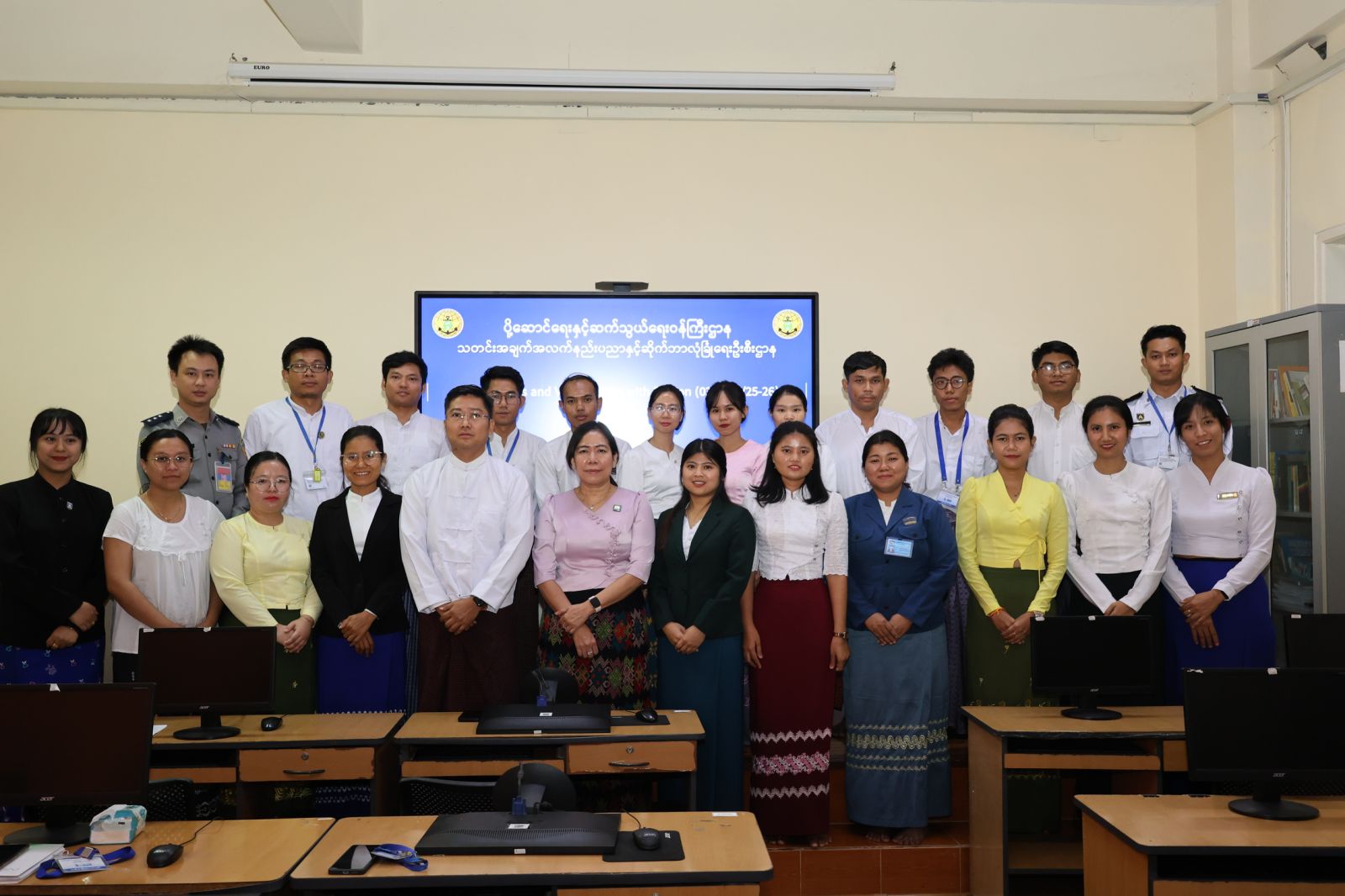 ပို့ဆောင်ရေးနှင့်ဆက်သွယ်ရေးဝန်ကြီးဌာန၊ သတင်းအချက်အလက်နည်းပညာနှင့်ဆိုက်ဘာလုံခြုံရေးဦးစီးဌာန၊ သတင်းအချက်အလက်နည်းပညာနှင့်ဆိုက်ဘာလုံခြုံရေးသင်တန်းကျောင်း၏ ၂၀၂၅-၂၆ လေ့ကျင့်သင်ကြားရေးနှစ်အတွင်း Data Analysis and Visualization with Python သင်တန်း၏ သင်တန်းဆင်းပွဲအခမ်းအနားကို ၂၀၂၆ ခုနှစ် မတ်လ ၁၀ ရက်နေ့ နေ့လည်ပိုင်းတွင်      e-Learning Center II တွင် ကျင်းပပြုလုပ်ခဲ့ရာ ပို့ဆောင်ရေးနှင့်ဆက်သွယ်ရေးဝန်ကြီးဌာန၊ သတင်းအချက်အလက်နည်းပညာနှင့်ဆိုက်ဘာလုံခြုံရေးဦးစီးဌာန၊ သတင်းအချက်အလက်နည်းပညာနှင့်ဆိုက်ဘာလုံခြုံရေးသင်တန်းကျောင်း ကျောင်းအုပ် ဒေါ်နှင်းခိုင်အေးနှင့်တကွ ဌာနအကြီးအကဲများ၊ ပြည်ထောင်စုအဆင့်အဖွဲ့အစည်းများနှင့် ပြည်ထောင်စုဝန်ကြီးဌာန အသီးသီးမှ သင်တန်းသား/သင်တန်းသူများ စုစုပေါင်း ၂၂ ဦး တက်ရောက်ခဲ့ကြောင်း သိရှိ ရပါသည်။