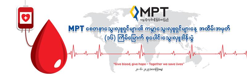 သွေးလှူဒါန်း၍ လူအများ၏အသက်ကို မည်သို့ကယ်တင်နိုင်မည်ကို ပိုမိုလေ့လာနိုင်ရန် https://www.donatebloodmyanmar.org/ တွင် ဝင်ရောက်လေ့လာနိုင်ပါသည်။ MPT ၏ လူမှုအကျိုးပြုလုပ်ငန်း များနှင့် ပတ်သက်၍ http://mpt.com.mm/mm/about-home/csr-activities-mm/ တွင် ဝင်ရောက်ကြည့်ရှုနိုင်ပါသည်။