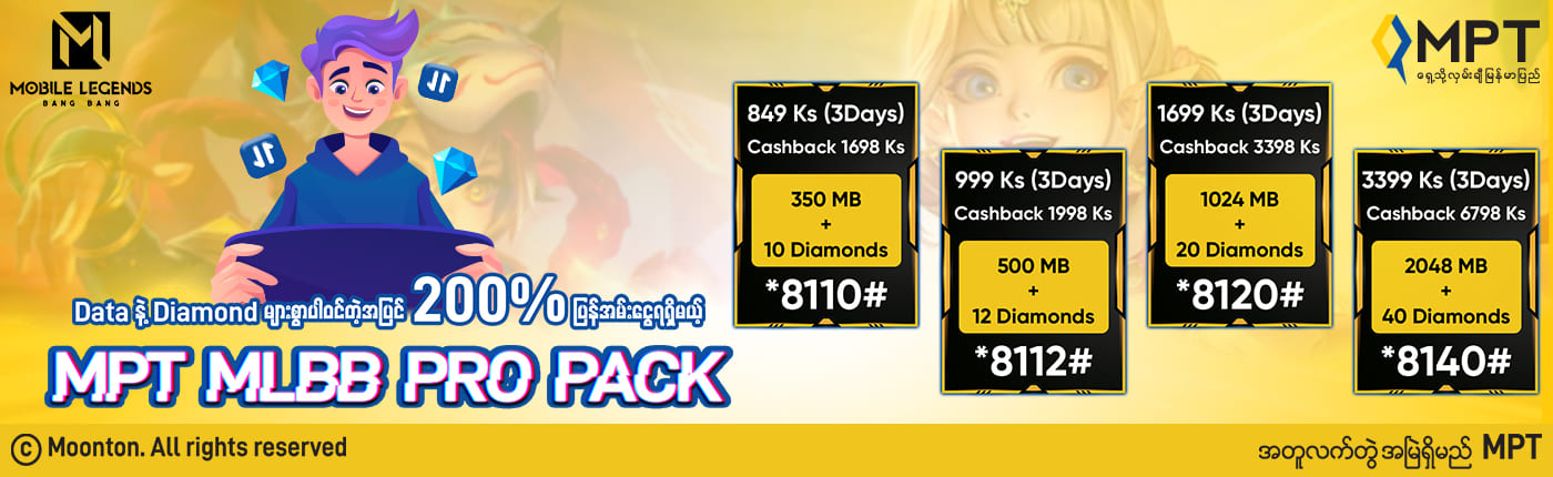 | Mobile Legends Data Pack (10 Diamonds) | 350 MB | ၈၄၉ ကျပ် | Diamond ၁၀ခု နှင့် ၂၀၀% ပြန်အမ်းငွေ | ၃ ရက် | *8110# | -MPT4U အက်ပလီကေးရှင်း -MPT ဝက်ဘ်ဆိုက် -MPT Pay |