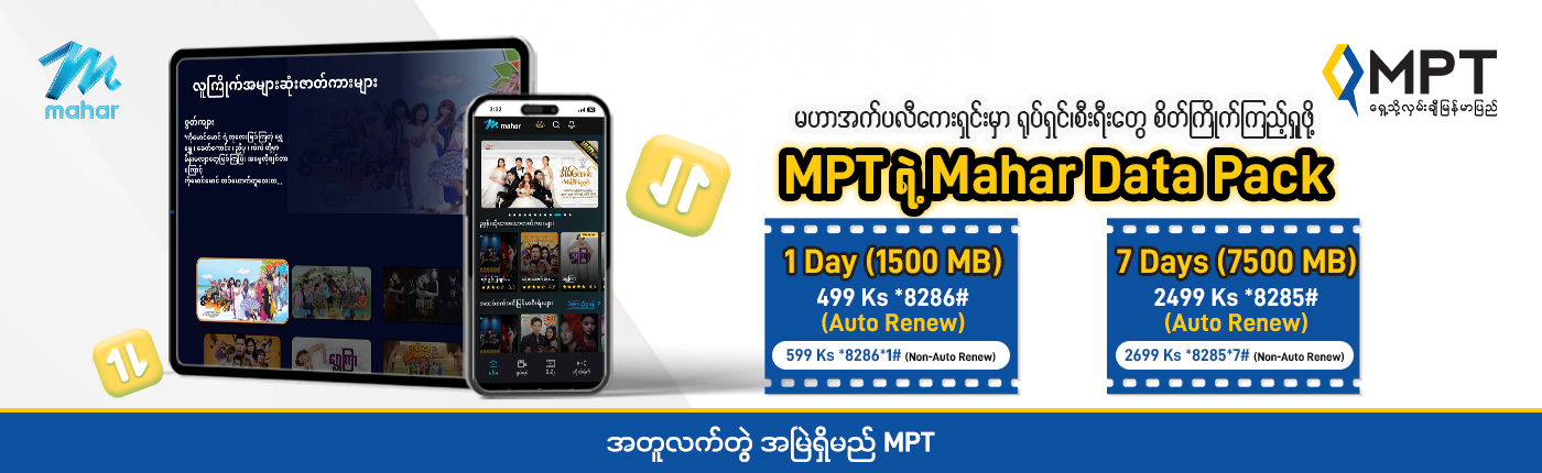 (ရန်ကုန်၊ ၂၀၂၄ ခုနှစ်၊ စက်တင်ဘာလ ၂ ရက်) – MPT က ရုပ်ရှင်ချစ်သူများ မြန်မာရုပ်ရှင်နှင့် ဇာတ်လမ်းတွဲများ ကြည့်ရှုရာတွင် ပိုမိုကောင်းမွန်သော ခံစားမှုရသအတွေ့အကြုံကောင်းများကို ဈေးနှုန်းသက်သက်သာသာဖြင့် ကြည့်ရှုနိုင်စေရန် ရည်ရွယ်၍ Mahar Data Pack ကို မိတ်ဆက်လိုက်ပြီဖြစ်ပါသည်။ သုံးစွဲသူများသည် ပြည်တွင်းမှ မိမိတို့နှစ်သက်ရာ ရုပ်ရှင်နှင့် ဇာတ်လမ်းတွဲများကို ဒေတာကုန်ကျစရိတ်အတွက် စိုးရိမ်စရာမလိုဘဲ ၄၉၉ ကျပ်မှစ၍ ဝယ်ယူရရှိနိုင်မည်ဖြစ်ပါသည်။