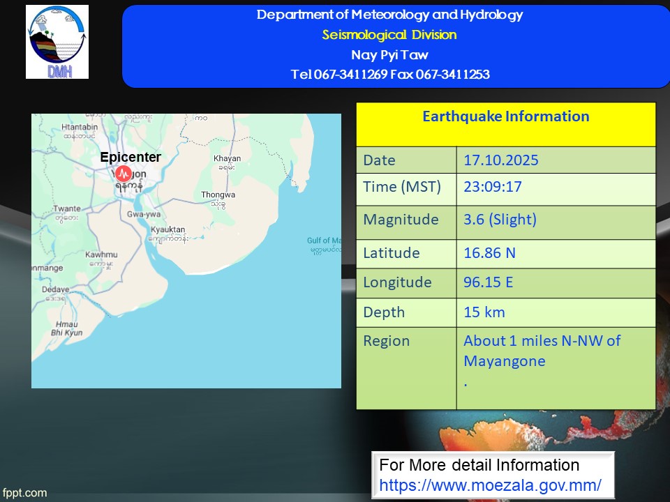 ၂၀၂၅ ခုနှစ်၊ အောက်တိုဘာလ ၁၇ ရက်နေ့၊ မြန်မာစံတော်ချိန် (၂၃)နာရီ၊ (၀၉)မိနစ်၊ (၁၇) စက္ကန့်အချိန်တွင် ကမ္ဘာအေးမြေငလျင်စခန်းမှ အနောက်-အနောက်တောင်ဘက် (၁) မိုင်ခန့် ကွာဝေးသော မြန်မာနိုင်ငံပြည်တွင်း (မရမ်းကုန်းမြို့နယ်၏ မြောက်-အနောက်မြောက်ဘက် (၁) မိုင်ခန့်အကွာ) မြောက်လတ္တီတွဒ် (၁၆.၈၆) ဒီဂရီ၊ အရှေ့လောင်ဂျီတွဒ် (၉၆.၁၅) ဒီဂရီ၊ အနက်(၁၅) ကီလိုမီတာကို ဗဟိုပြု၍ အင်အား ရစ်(ခ်)တာစကေး (၃.၆) အဆင့်ရှိ အင်အားအနည်းငယ်ရှိသော မြေငလျင်တစ်ခု လှုပ်ရှားသွားကြောင်း တိုင်းထွာရရှိပါသည်။