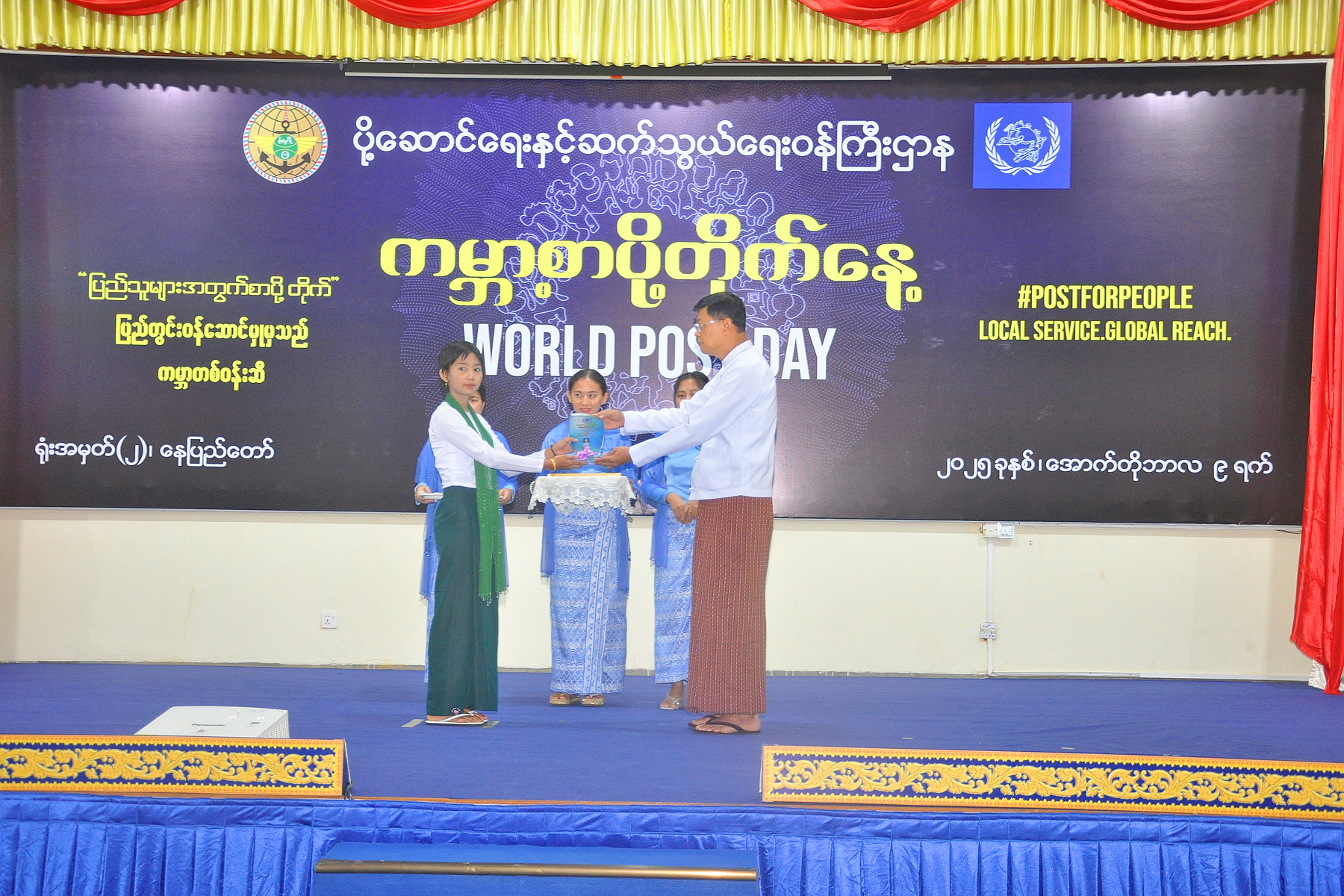 ထို့နောက် ပြည်ထောင်စုဝန်ကြီး ဦးမြထွန်းဦးမှ ကမ္ဘာ့စာပို့တိုက်နေ့ အထိမ်းအမှတ်အခမ်းအနားတွင် (၅၄) ကြိမ်မြောက် အသက် (၁၅) နှစ်နှင့်အောက် နိုင်ငံတကာလူငယ်များ ပေးစာရေးပြိုင်ပွဲ (ပြည်တွင်းအဆင့်) ၌ ပထမဆုရရှိသည့် တနင်္သာရီတိုင်းဒေသကြီး မြိတ်မြို့ နယ်မှ မဝင်းလဲ့ရွှေရည်၊ ဒုတိယဆုရရှိသည့် ပဲခူးတိုင်းဒေသကြီး၊ ညောင်လေးပင်မြို့နယ်မှ မနှင်းအိရွှေရည်၊ တတိယဆုရရှိသည့် မကွေးတိုင်းဒေသကြီးစေတုတ္တရာမြို့နယ်မှ မောင်ဇော်သူရ နှင့် အထူးဆုရရှိသည့် နေပြည်တော်၊ ဇမ္ဗူသီရိမြို့နယ်မှ မမိုးပြည့်စုံကြွယ် တို့ကို ဂုဏ်ပြုဆုများပေးအပ် ချီးမြှင့်ခဲ့ပါသည်။ ဆက်လက်၍ ပို့ဆောင်ရေးနှင့်ဆက်သွယ်ရေးဝန်ကြီးဌာန၊ ဒုတိယဝန်ကြီး ဦးအောင်ကျော်ထွန်းမှ နိုင်ငံတကာလူငယ်များပေးစာရေးပြိုင်ပွဲ (ပြည်တွင်းအဆင့်) အတွက် အကဲဖြတ်ပေးကြသော အကဲဖြတ်အဖွဲ့ဝင်များအား ဂုဏ်ပြုမှတ်တမ်းလွှာ များပေးအပ်ခဲ့ပါသည်။