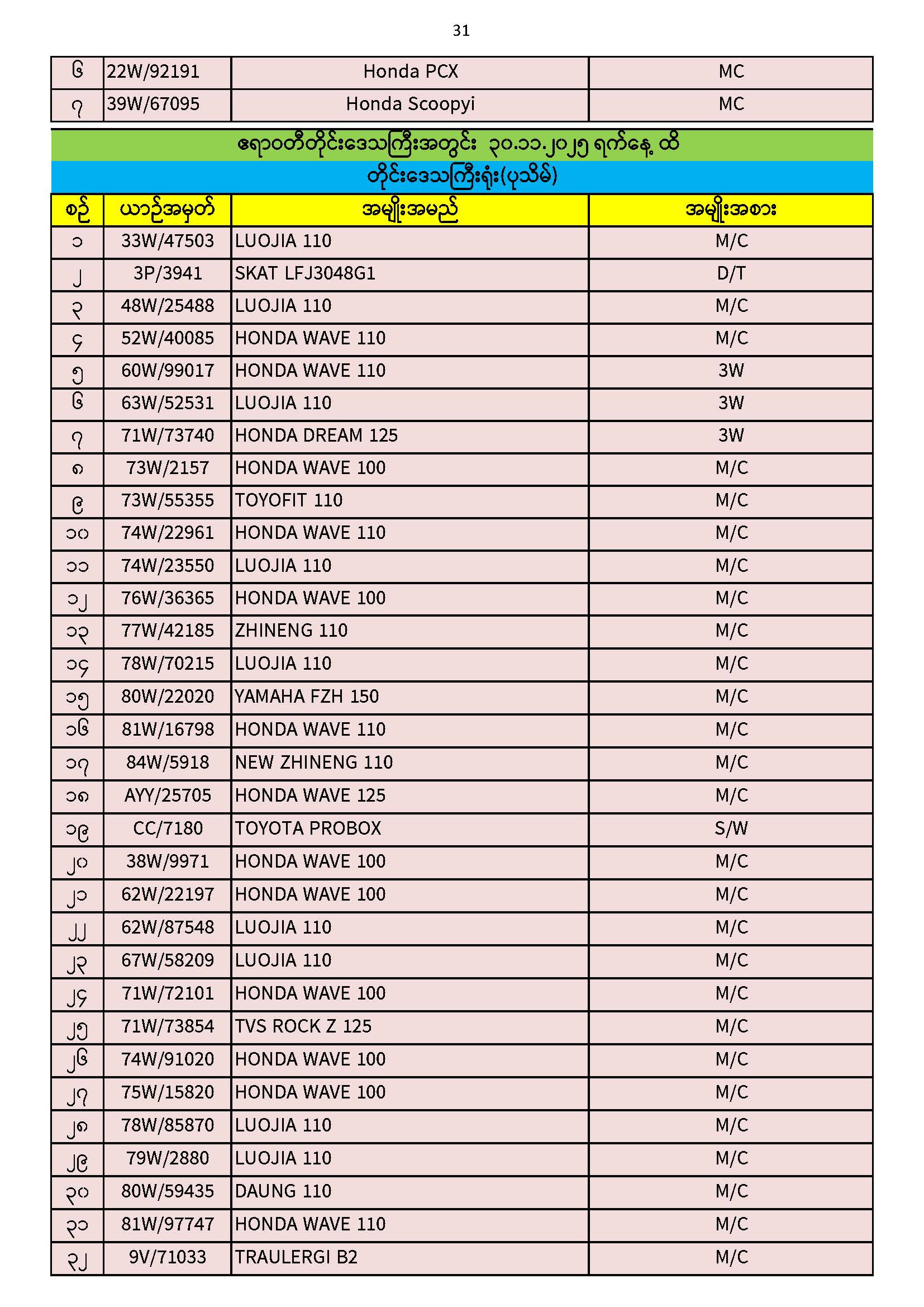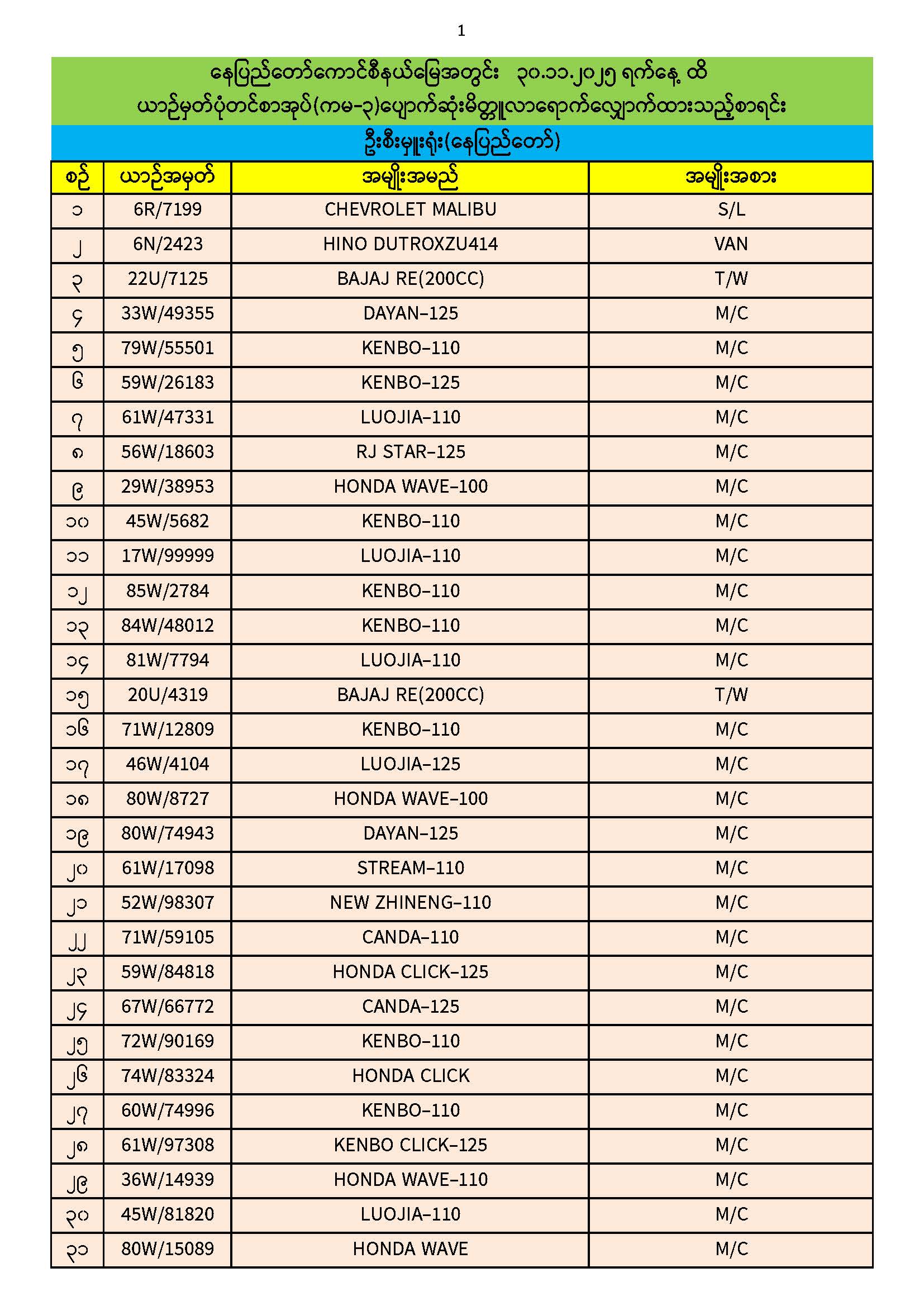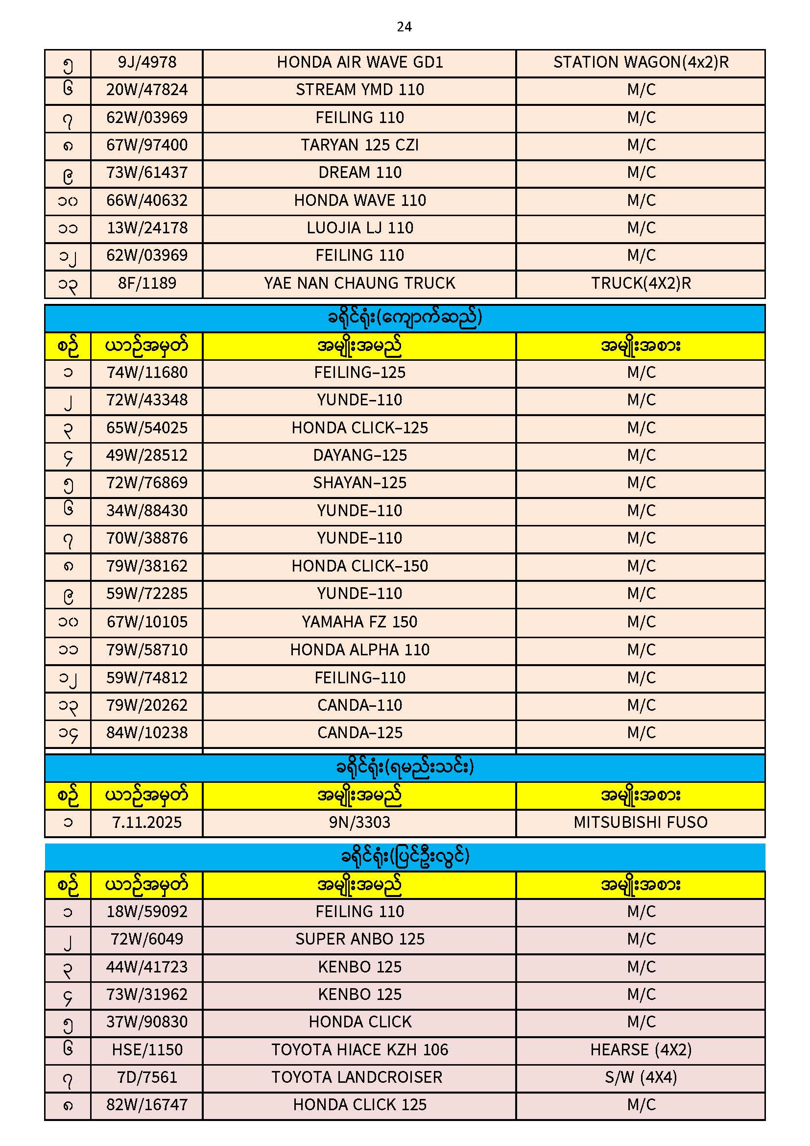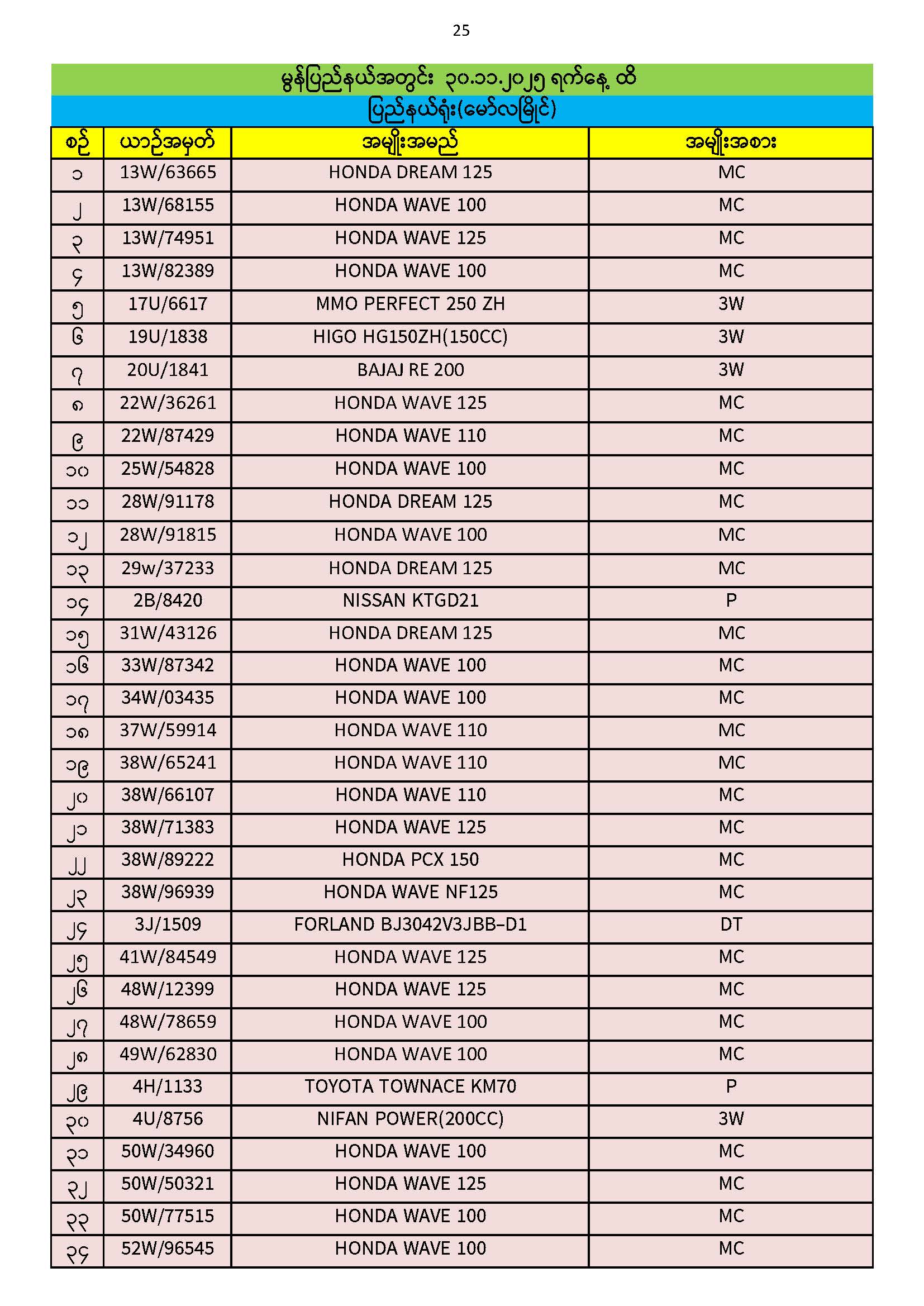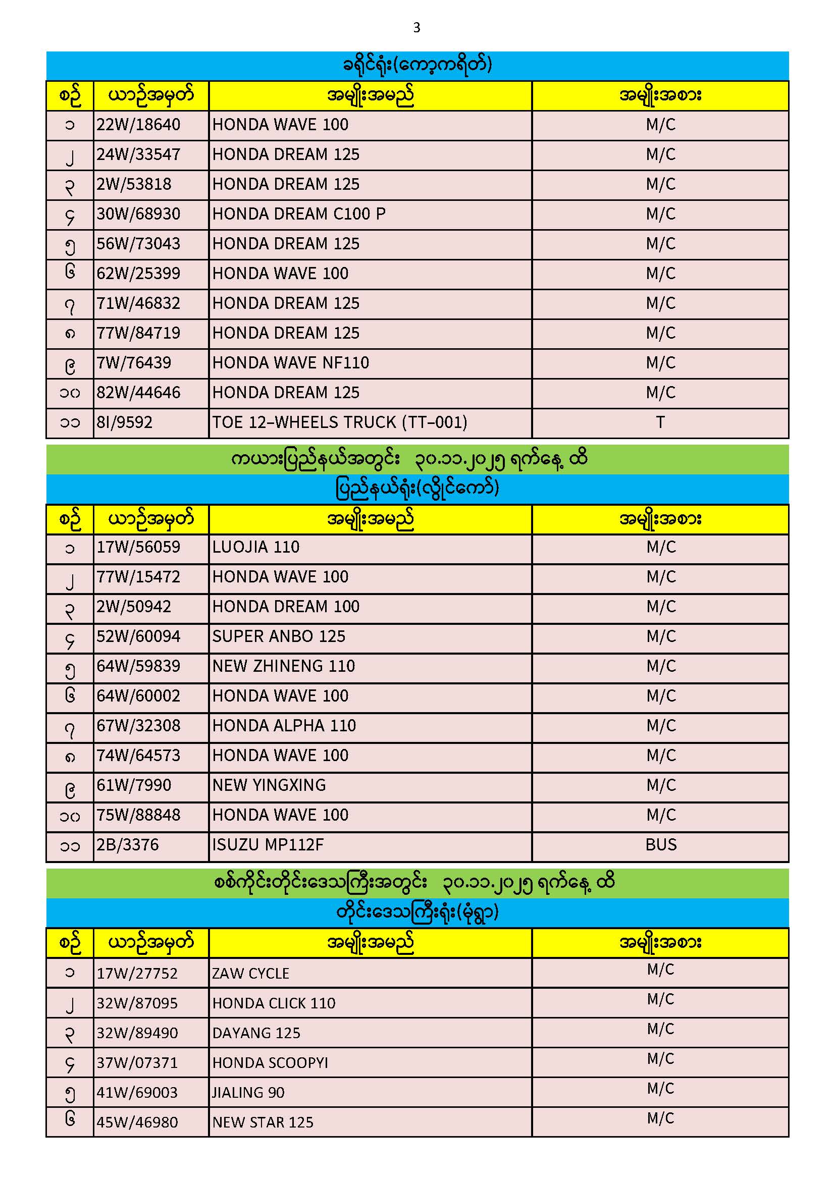 ၃၀.၁၁.၂၀၂၅ ရက်နေ့ထိ ယာဉ်မှတ်ပုံတင်စာအုပ်(ကမ-၃) ပျောက်ဆုံးမိတ္တူလာရောက် လျှောက်ထားသည့်စာရင်း Published: 04 Dec, 2025 Place: ကုန်းလမ်းပို့ဆောင်ရေးညွှန်ကြားမှုဦးစီးဌာန