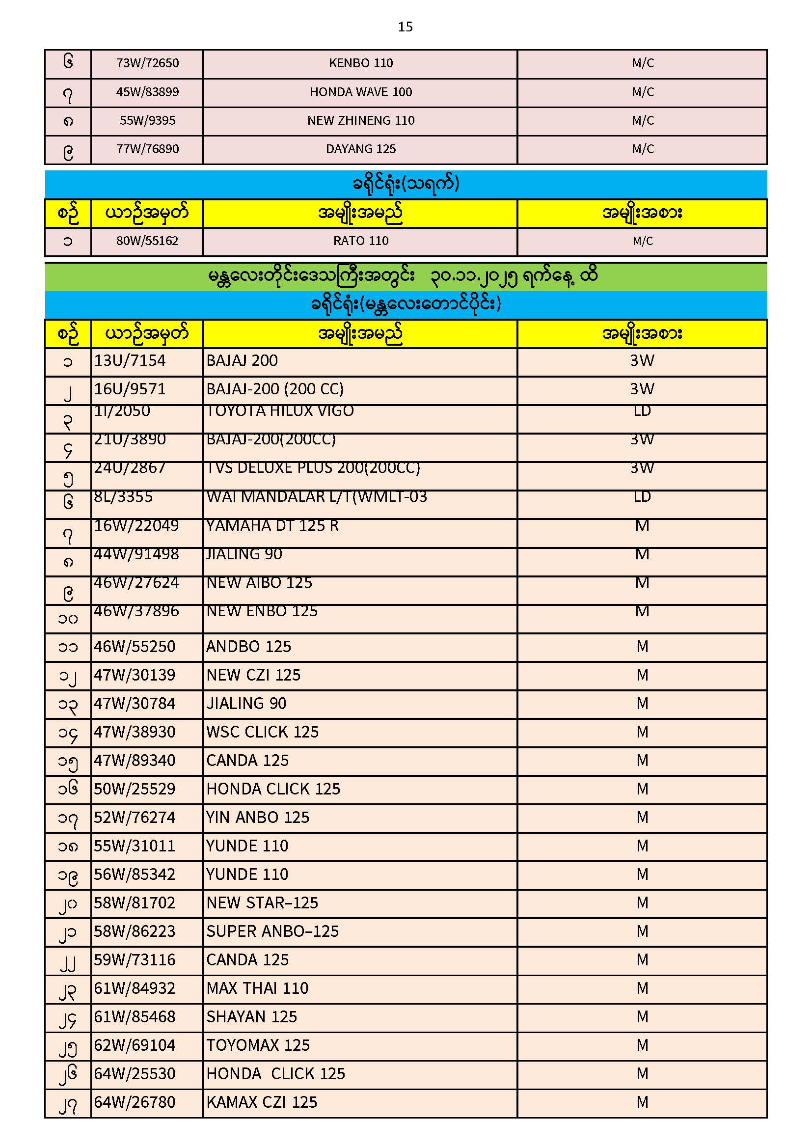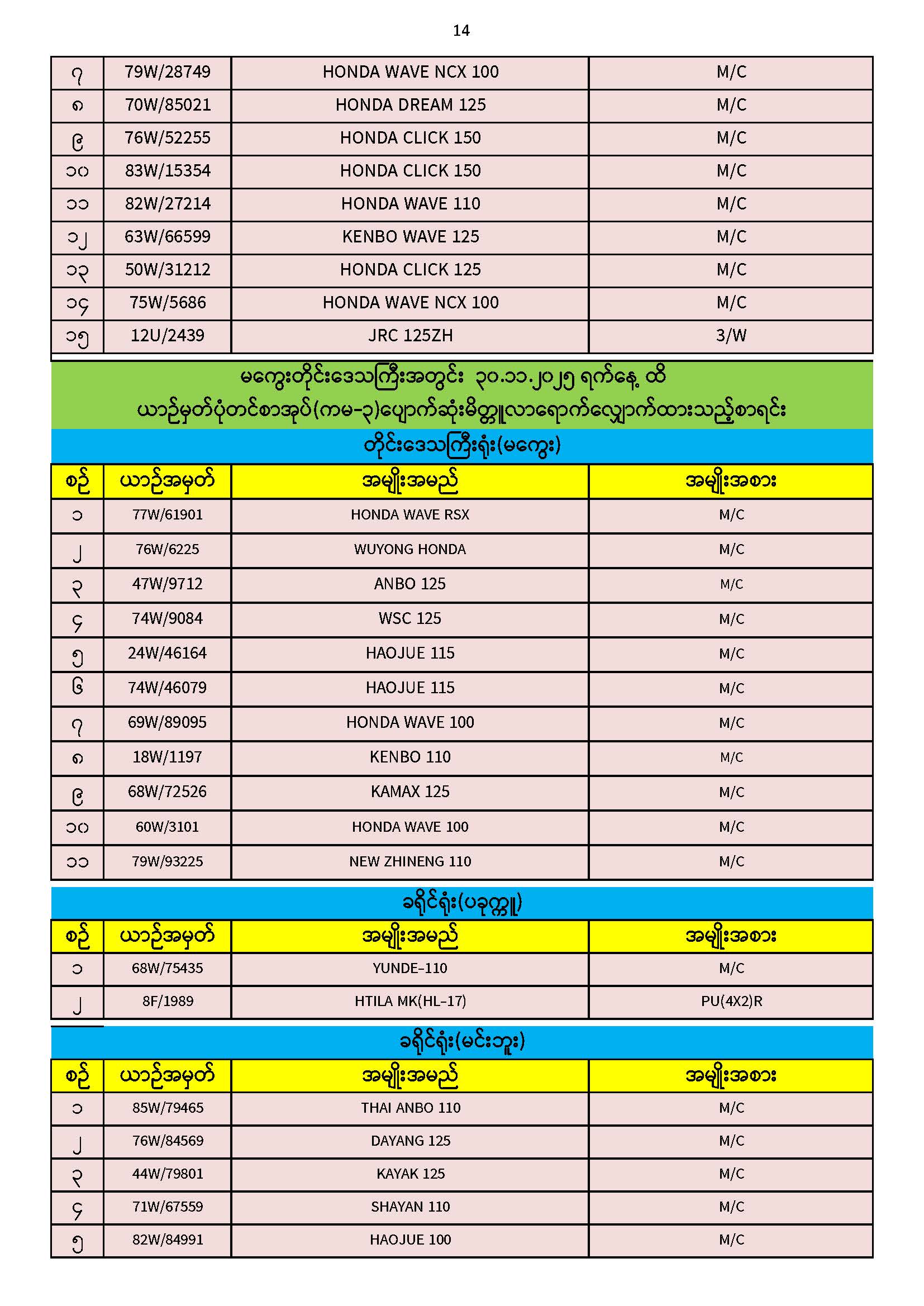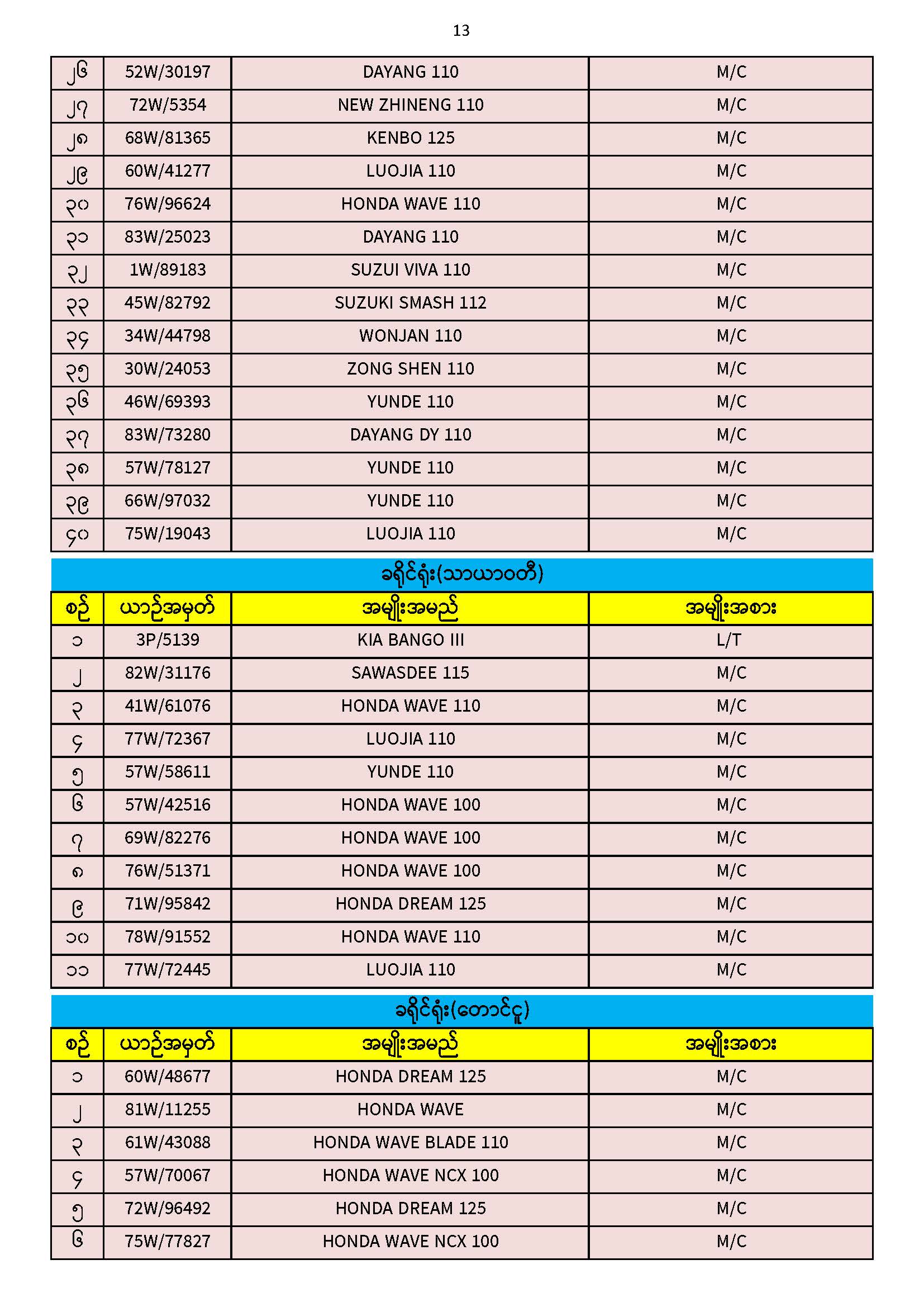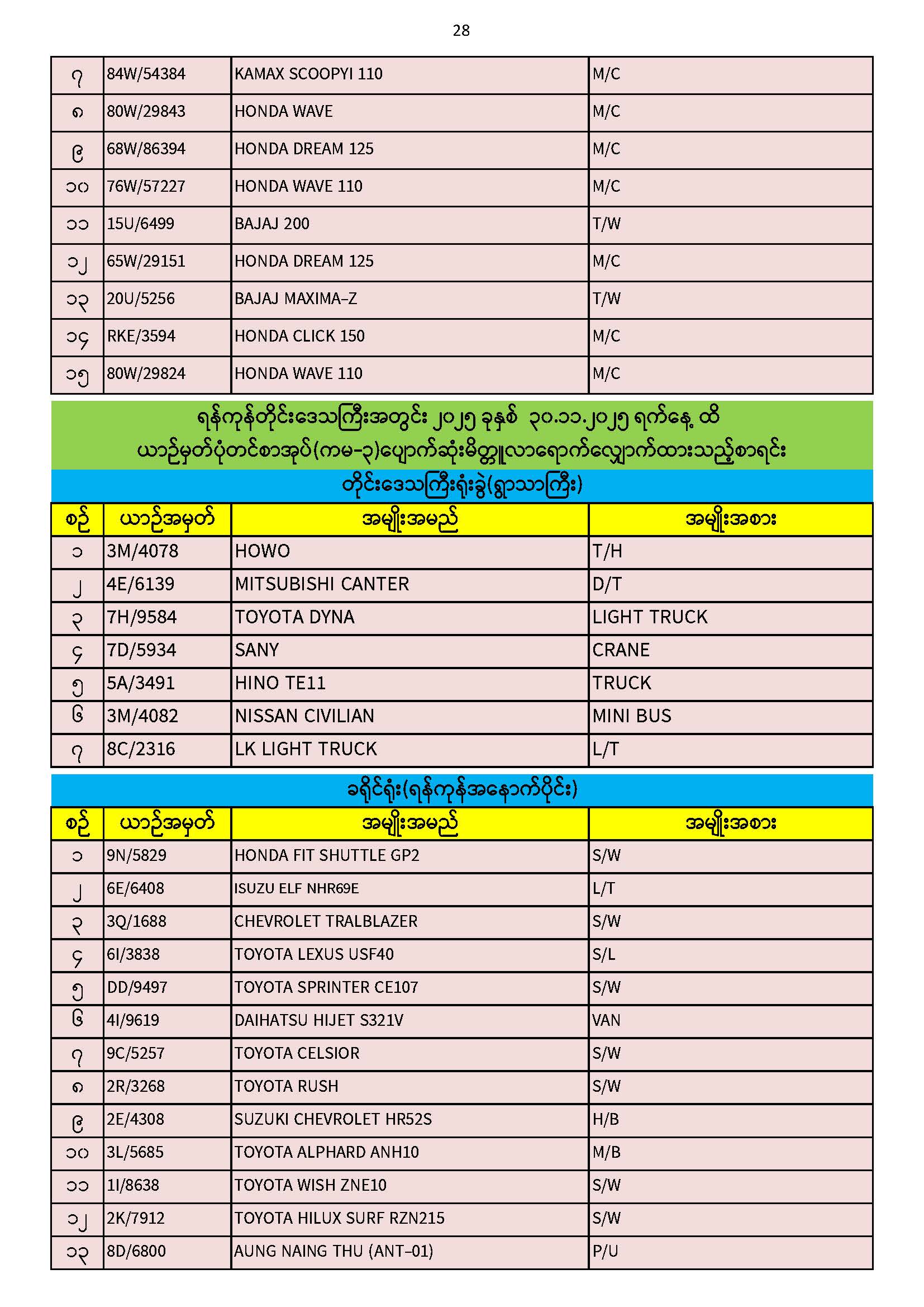 ၃၀.၁၁.၂၀၂၅ ရက်နေ့ထိ ယာဉ်မှတ်ပုံတင်စာအုပ်(ကမ-၃) ပျောက်ဆုံးမိတ္တူလာရောက် လျှောက်ထားသည့်စာရင်း Published: 04 Dec, 2025 Place: ကုန်းလမ်းပို့ဆောင်ရေးညွှန်ကြားမှုဦးစီးဌာန
