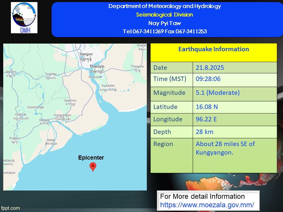 ၂၀၂၅ ခုနှစ်၊ စက်တင်ဘာလ ၃၀ ရက်နေ့၊ မြန်မာစံတော်ချိန် (၀၇)နာရီ၊ (၁၀)မိနစ်၊ (၁၂) စက္ကန့် အချိန်တွင် တမူးမြေငလျင်စခန်းမှ အရှေ့-အရှေ့တောင်ဘက် (၄၂) မိုင်ခန့်ကွာဝေးသော မြန်မာနိုင်ငံပြည်တွင်း (ဖောင်းပြင်မြို့၏ အရှေ့တောင်ဘက် (၁၄) မိုင်ခန့်အကွာ) မြောက်လတ္တီတွဒ် (၂၄.၁၀) ဒီဂရီ၊ အရှေ့လောင်ဂျီတွဒ် (၉၄.၉၅) ဒီဂရီ၊ အနက်(၆၅) ကီလိုမီတာကို ဗဟိုပြု၍ အင်အား ရစ်(ခ်)တာ စကေး (၄.၉) အဆင့်ရှိ အင်အားအနည်းငယ်ရှိသော မြေငလျင်တစ်ခု လှုပ်ရှားသွား ကြောင်း တိုင်းထွာရရှိပါသည်။