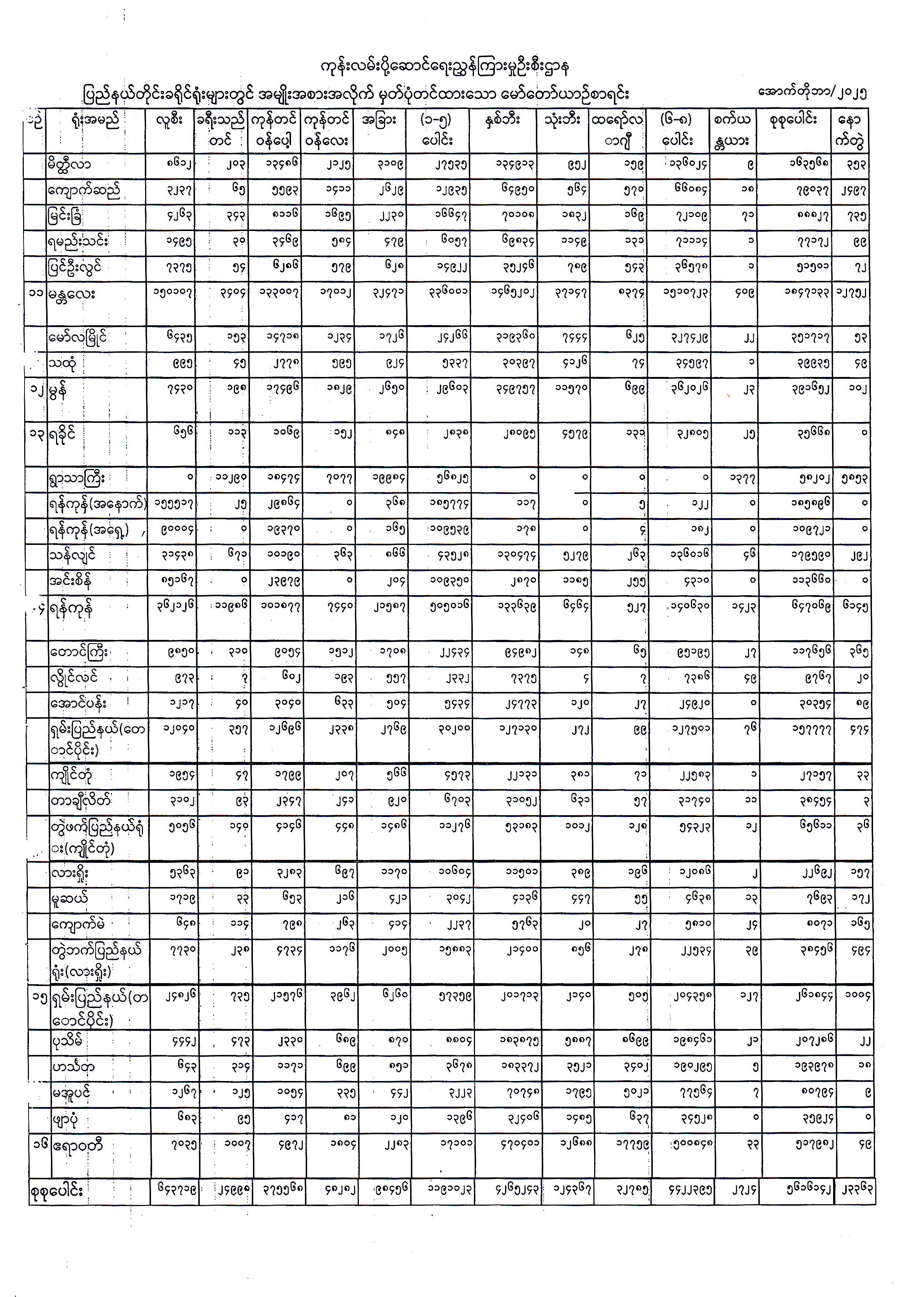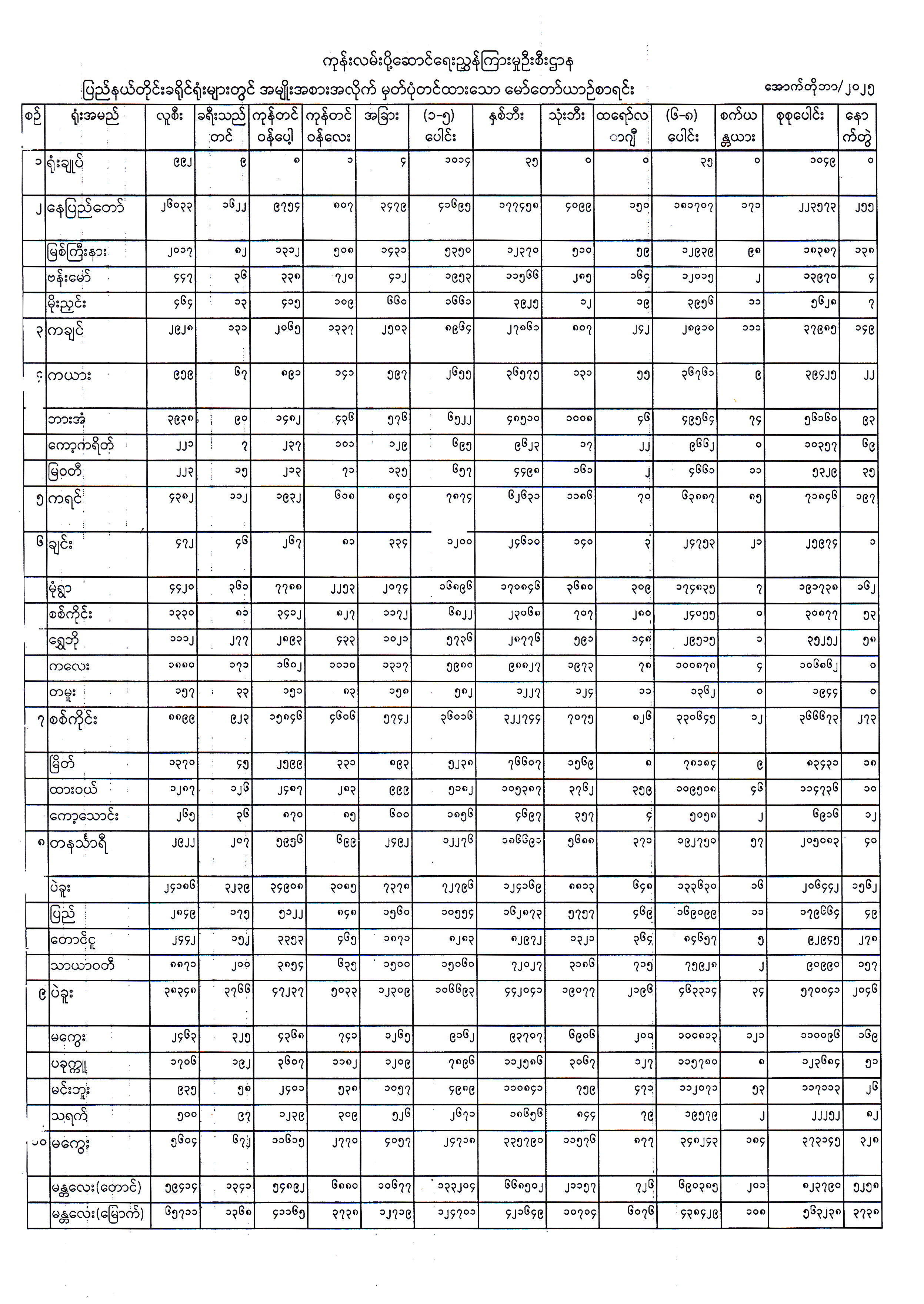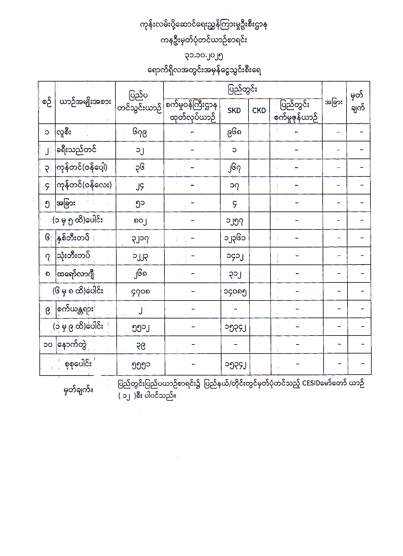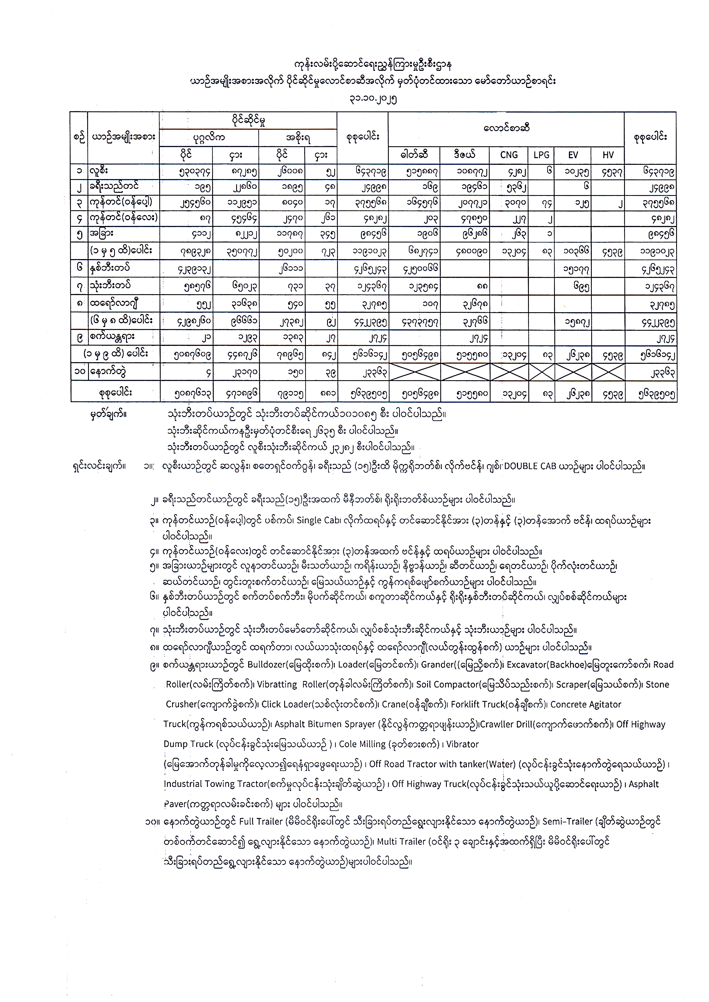 ၂၀၂၅ ခုနှစ်၊ အောက်တိုဘာလထိ ပြည်နယ်တိုင်းခရိုင်ရုံးများတွင် အမျိုးအစားအလိုက် မှတ်ပုံတင်ထားသော မော်တော်ယာဉ်စာရင်း Published: 05 Nov, 2025 Place: ကုန်းလမ်းပို့ဆောင်ရေးညွှန်ကြားမှုဦးစီးဌာန