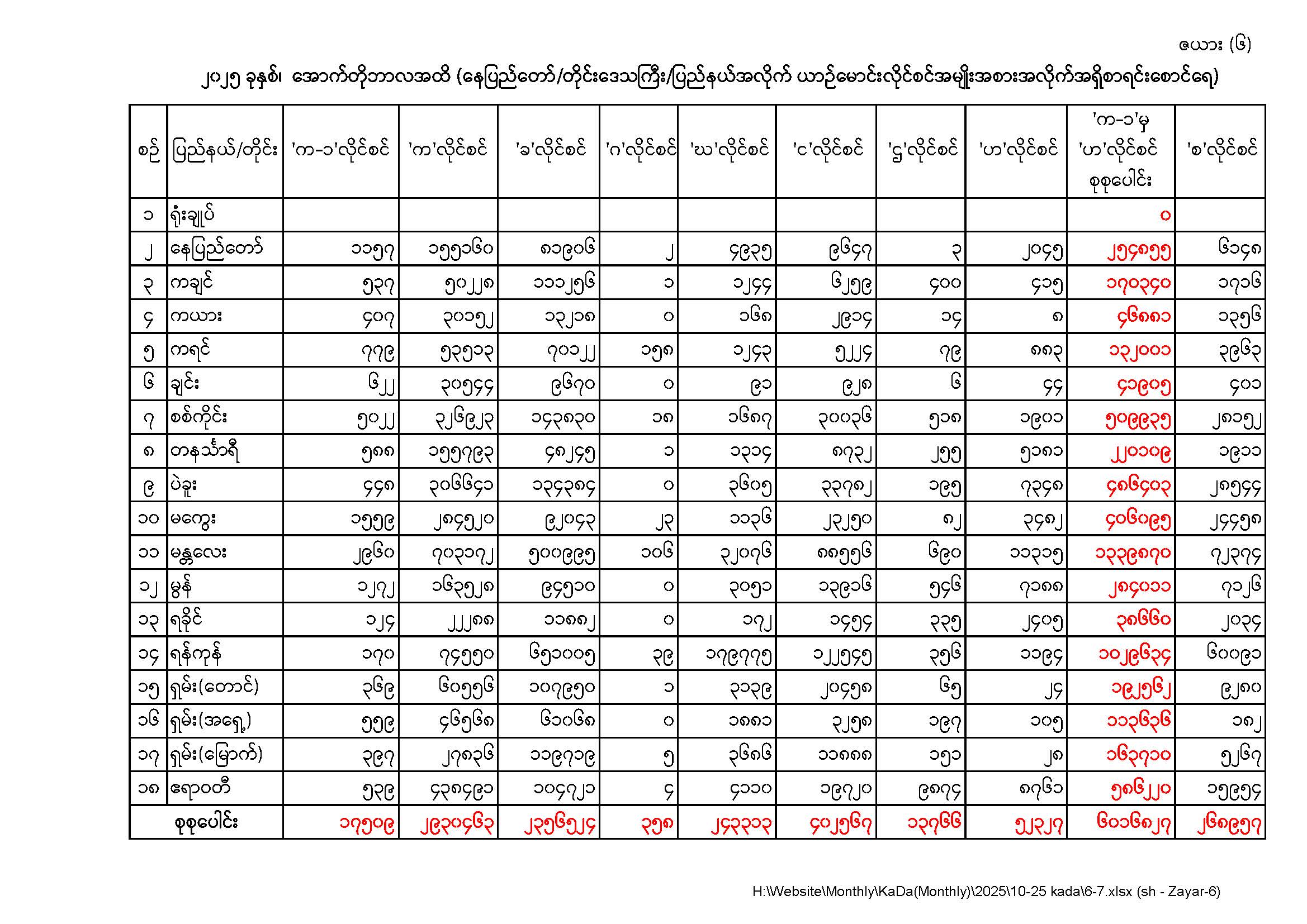 ၂၀၂၅ ခုနှစ်၊ အောက်တိုဘာလ အထိ (နေပြည်တော်/တိုင်းဒေသကြီး/ပြည်နယ်အလိုက် ယာဉ်မောင်းလိုင်စင်အမျိုးအစားအလိုက်အရှိစာရင်းစောင်ရေ) Published: 05 Nov, 2025 Place: ကုန်းလမ်းပို့ဆောင်ရေးညွှန်ကြားမှုဦးစီးဌာန