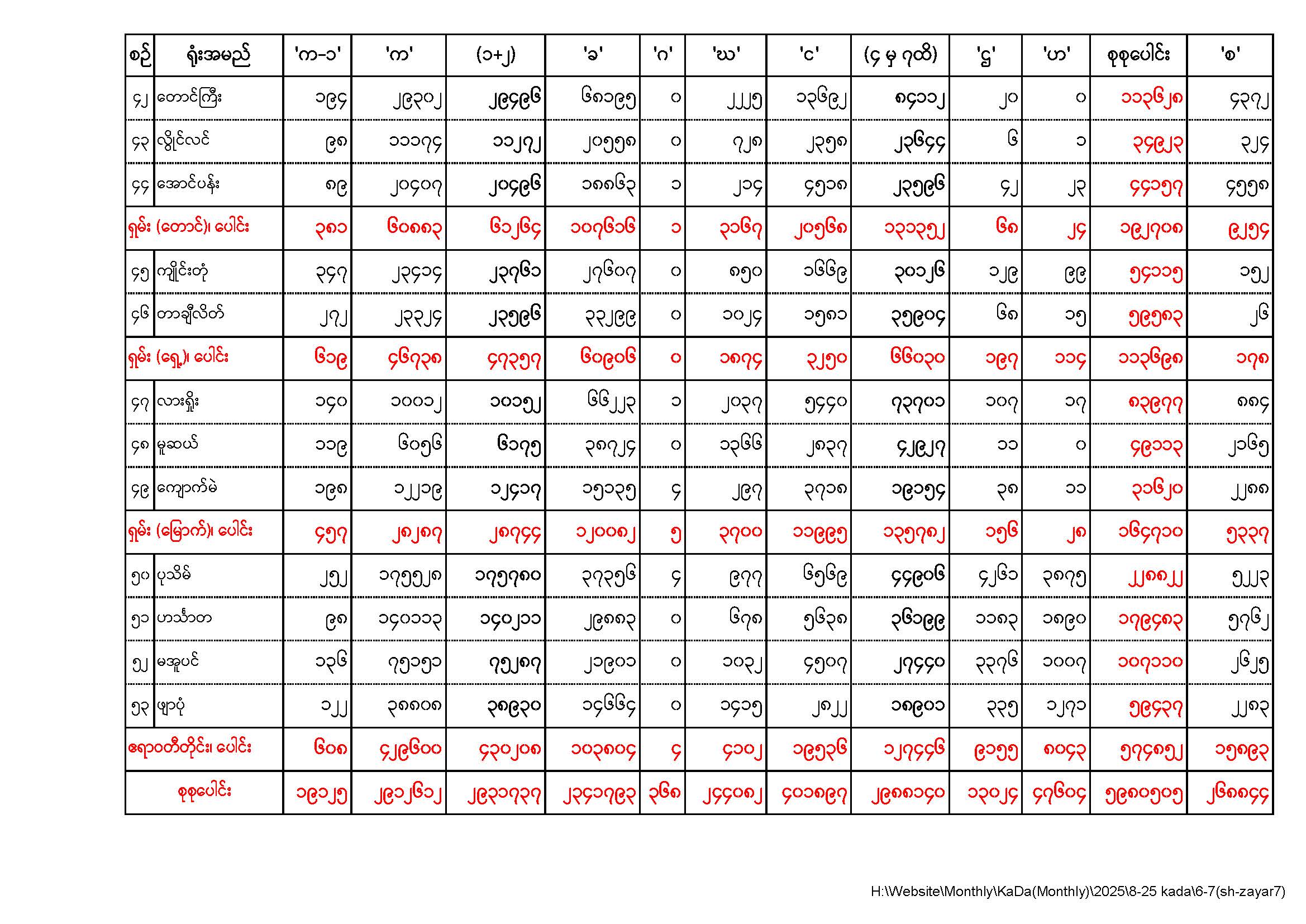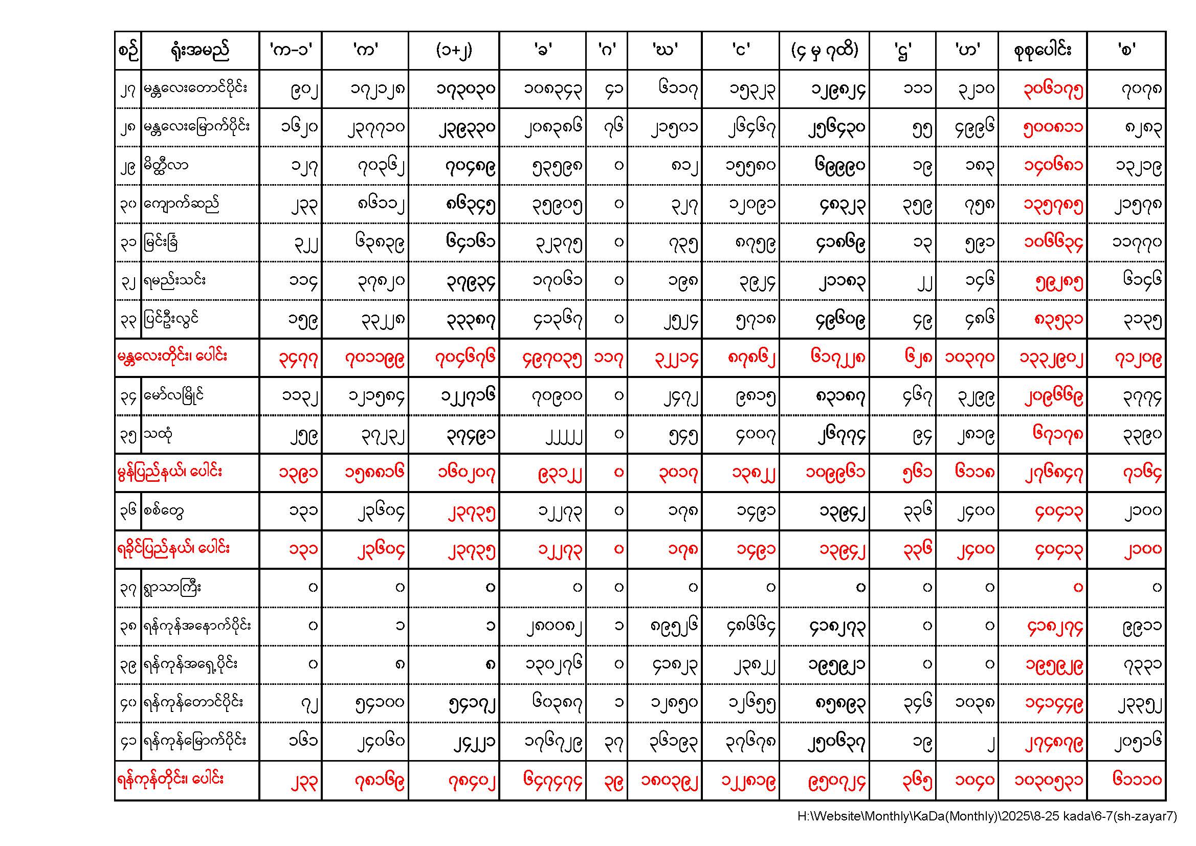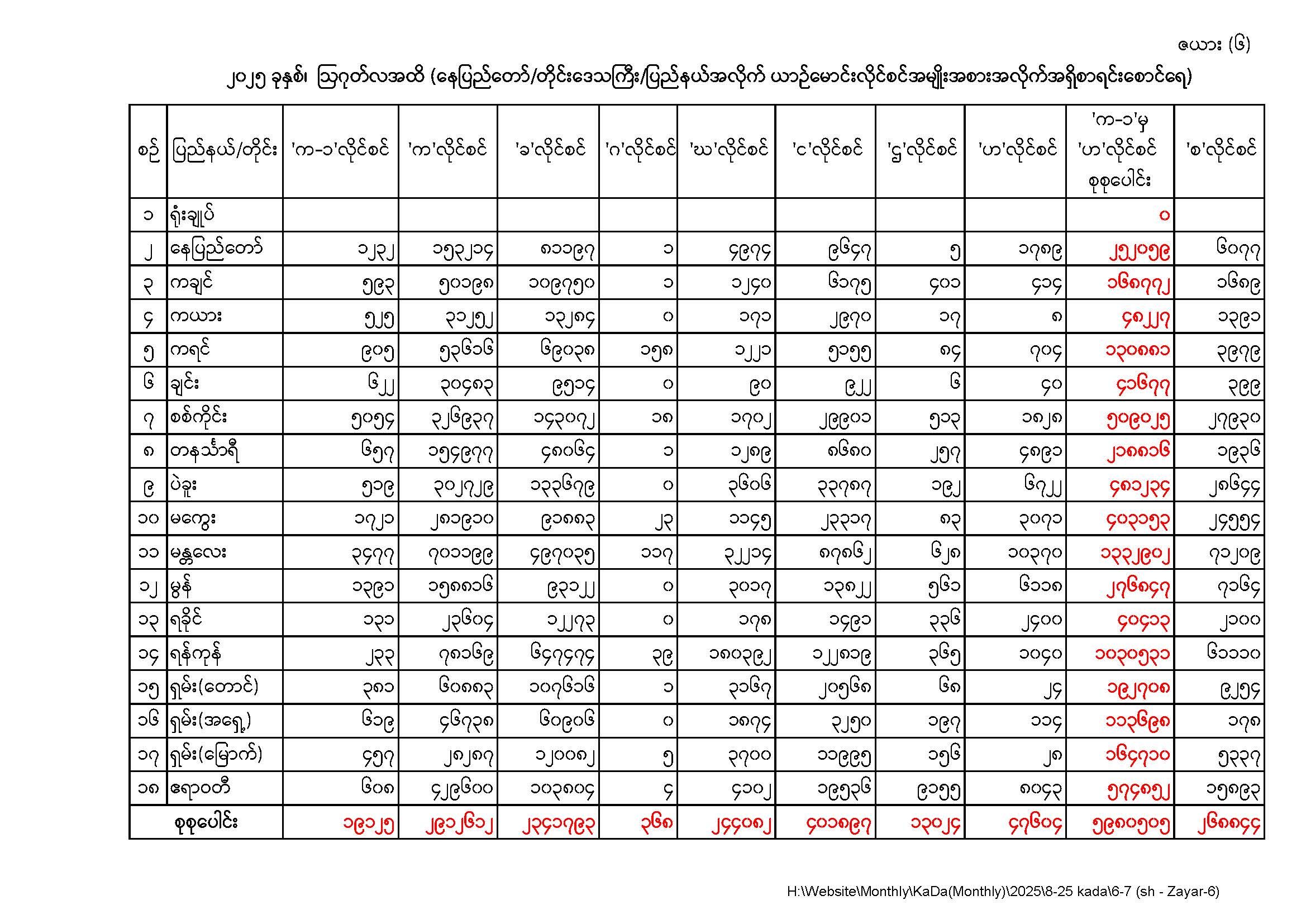 ၂၀၂၅ ခုနှစ်၊ ဩဂုတ်လ အထိ (နေပြည်တော်/တိုင်းဒေသကြီး/ပြည်နယ်အလိုက် ယာဉ်မောင်းလိုင်စင်အမျိုးအစားအလိုက်အရှိစာရင်းစောင်ရေ) Published: 01 Sep, 2025 Place: ကုန်းလမ်းပို့ဆောင်ရေးညွှန်ကြားမှုဦးစီးဌာန