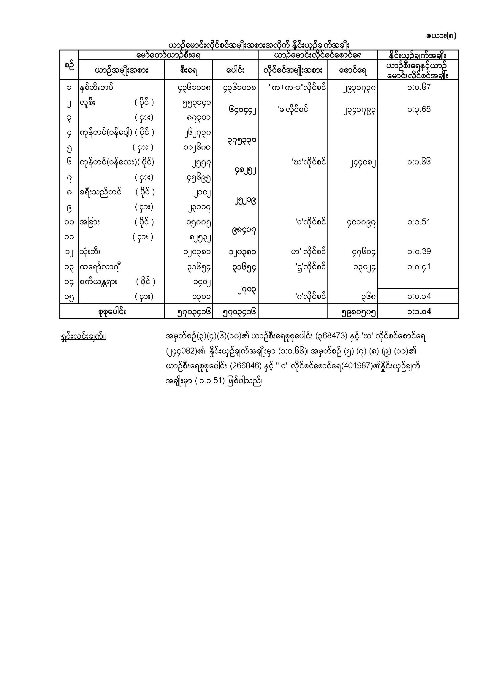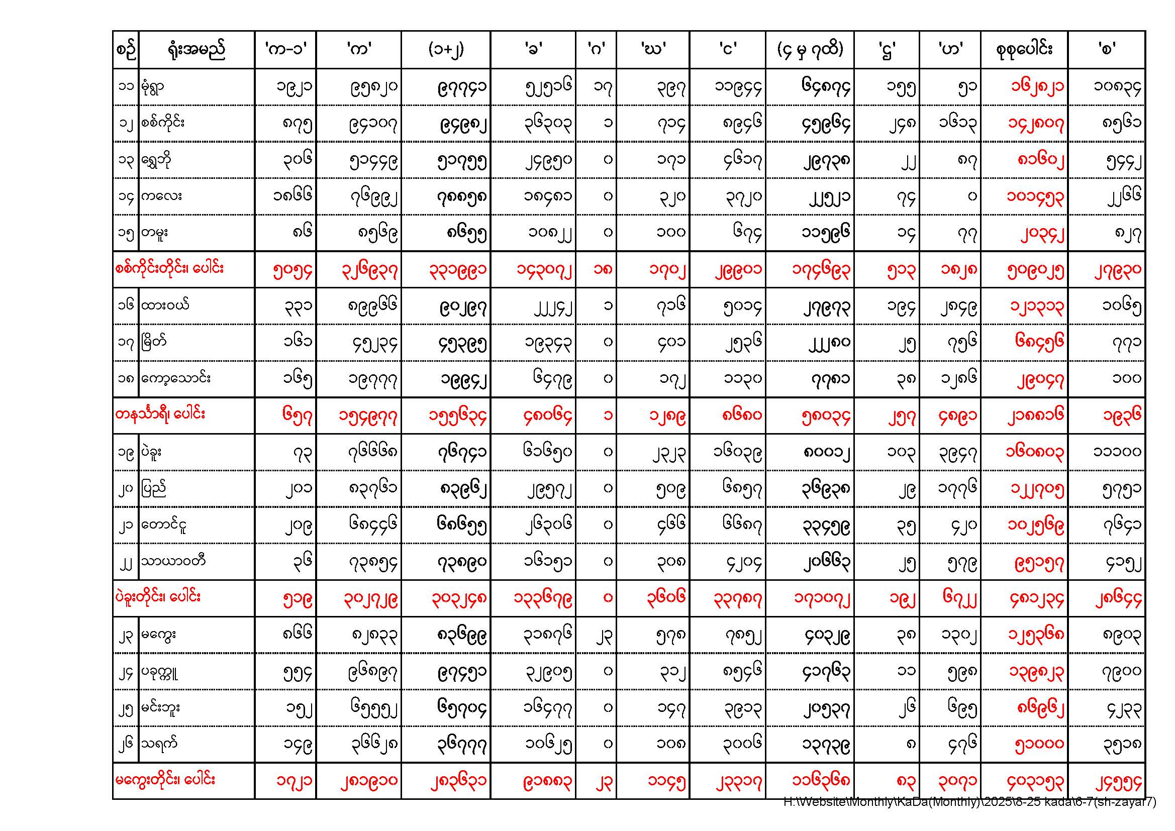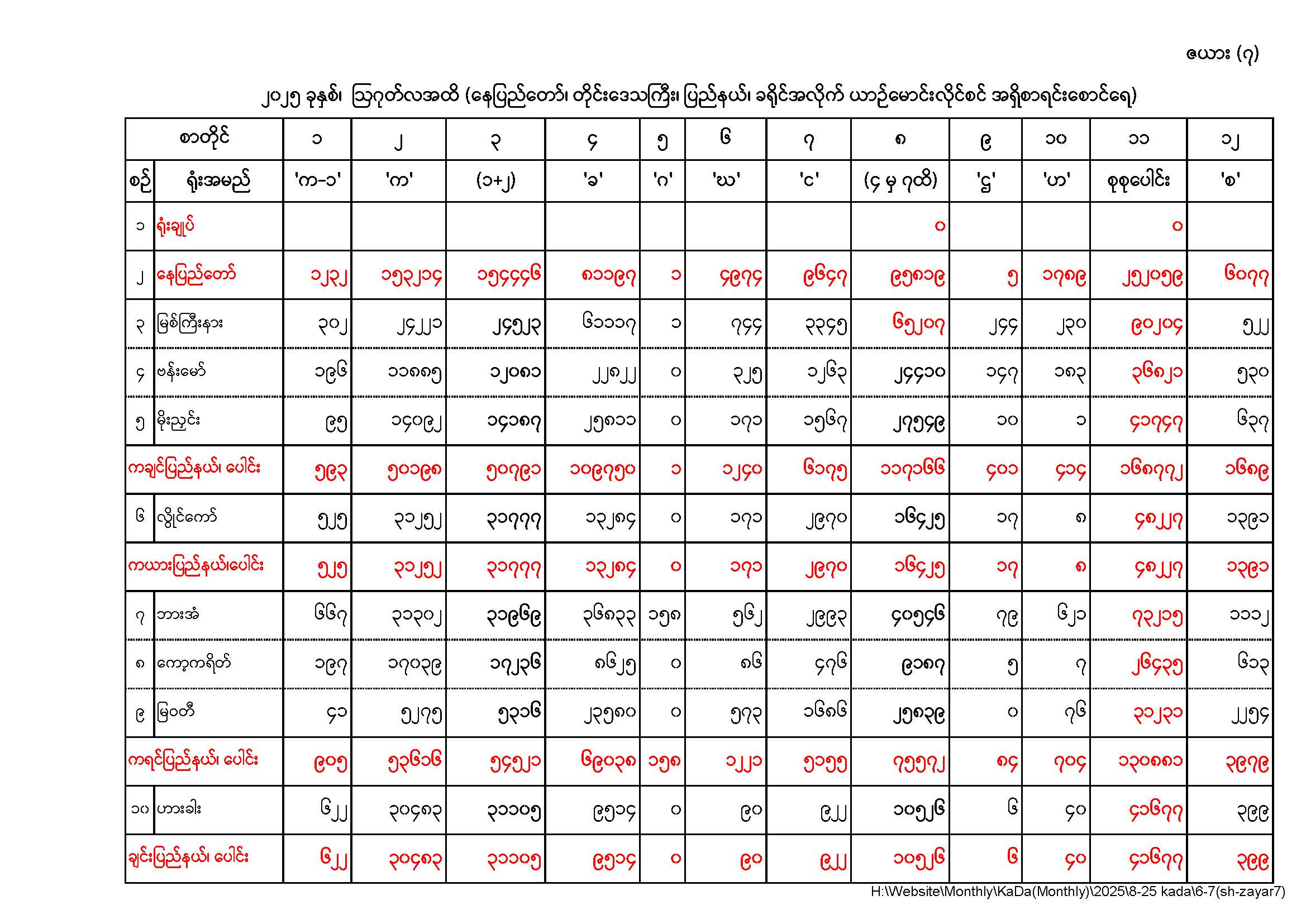 ၂၀၂၅ ခုနှစ်၊ ဩဂုတ်လ အထိ (နေပြည်တော်/တိုင်းဒေသကြီး/ပြည်နယ်အလိုက် ယာဉ်မောင်းလိုင်စင်အမျိုးအစားအလိုက်အရှိစာရင်းစောင်ရေ) Published: 01 Sep, 2025 Place: ကုန်းလမ်းပို့ဆောင်ရေးညွှန်ကြားမှုဦးစီးဌာန