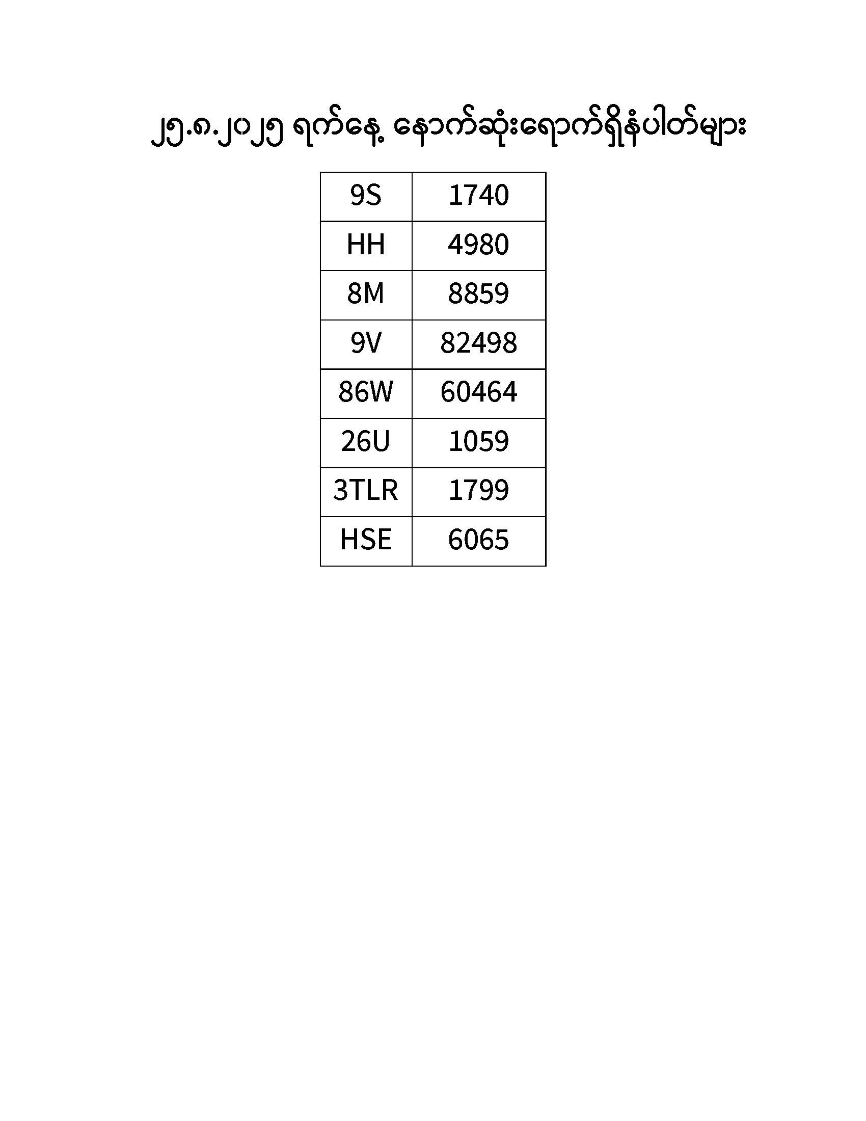 ၂၅.၈.၂၀၂၅ ရက်နေ့ထိ နောက်ဆုံးရောက်ရှိ နံပါတ်များ Published: 26 Aug, 2025 Place: ကုန်းလမ်းပို့ဆောင်ရေးညွှန်ကြားမှုဦးစီးဌာန