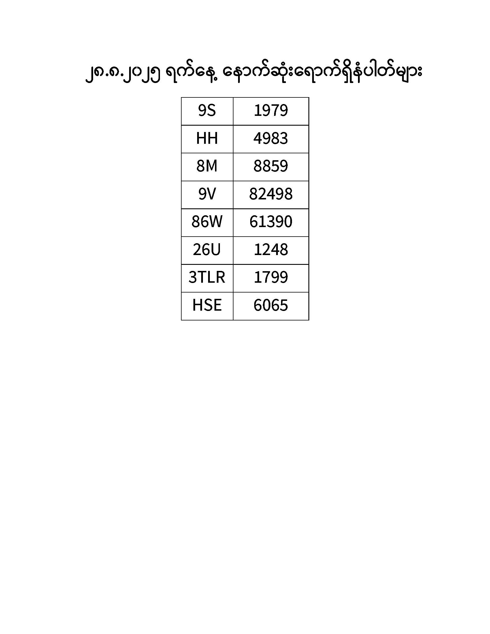 ၂၈.၈.၂၀၂၅ ရက်နေ့ထိ နောက်ဆုံးရောက်ရှိ နံပါတ်များ