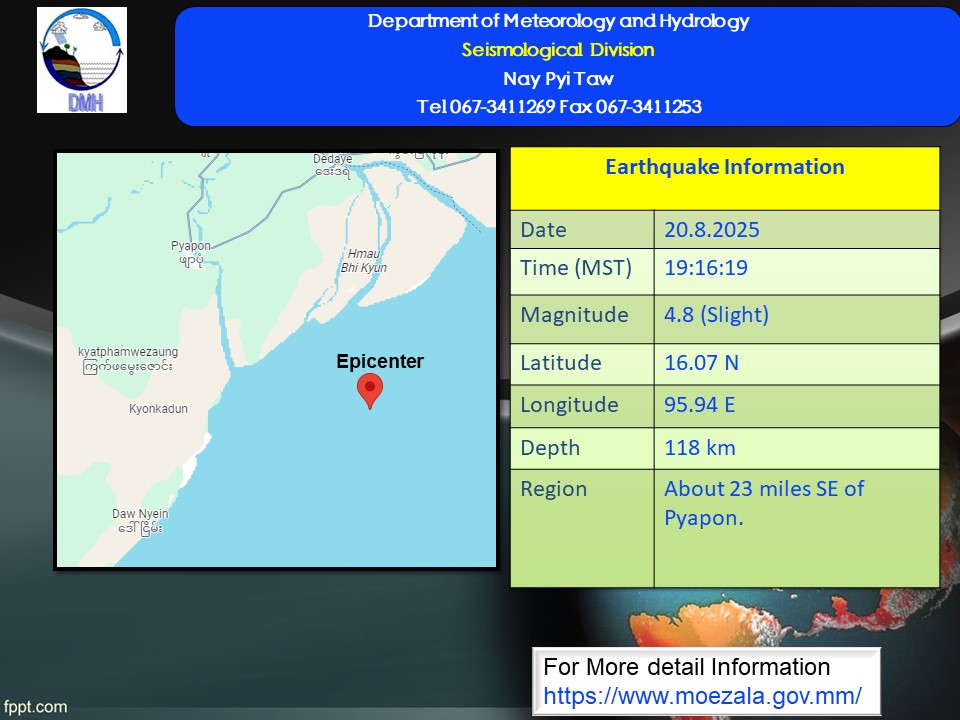 ၂၀၂၅ ခုနှစ်၊ သြဂုတ်လ ၂၀ ရက်နေ့၊ မြန်မာစံတော်ချိန် (၁၉)နာရီ(၁၆)မိနစ်(၁၉) စက္ကန့် အချိန်တွင် ကမ္ဘာအေးမြေငလျင်စခန်းမှ အနောက်တောင်ဘက် (၅၆) မိုင်ခန့်ကွာဝေးသော မြန်မာ့ ပင်လယ်ပြင်၊ (ဖျာပုံမြို့၏ အရှေ့တောင်ဘက် (၂၃) မိုင်ခန့်အကွာ) မြောက်လတ္တီတွဒ် (၁၆.၀၇) ဒီဂရီ၊ အရှေ့လောင်ဂျီတွဒ် (၉၅.၉၄) ဒီဂရီ၊ အနက် (၁၁၈) ကီလိုမီတာကို ဗဟိုပြု၍ အင်အားရစ်(ခ်)တာ စကေး (.) အဆင့်ရှိ အင်အားအနည်းငယ်ရှိသော မြေငလျင်တစ်ခု လှုပ်ရှားသွားကြောင်း တိုင်းထွာ ရရှိပါသည်။
