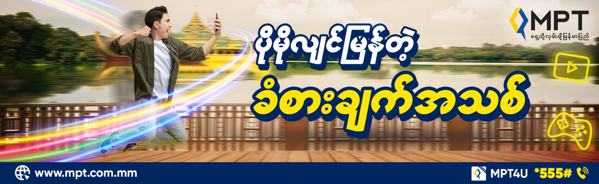 MPT ၏ ဝန်ဆောင်မှုများကို အစဉ်တစိုက်အသုံးပြုလျက်ရှိသည့် သုံးစွဲသူ တစ်ဦးတစ်ယောက်ချင်းစီတိုင်းကို ကျေးဇူးအထူးတင်ရှိပါသည်။ MPT အကြောင်း ပိုမိုသိရှိလိုပါက တရားဝင် ဝက်ဘ်ဆိုက်ဖြစ်သော www.mpt.com.mm နှင့် တိုက်ရိုက် တုံ့ပြန်ဖြေကြားပေးသည့် Chatbot ဝန်ဆောင်မှုများကို MPT4U အက်ပလီကေးရှင်း၊ MPT Viber သို့မဟုတ် 106 Call Center တို့တွင် စုံစမ်းမေးမြန်းနိုင်ပါသည်။