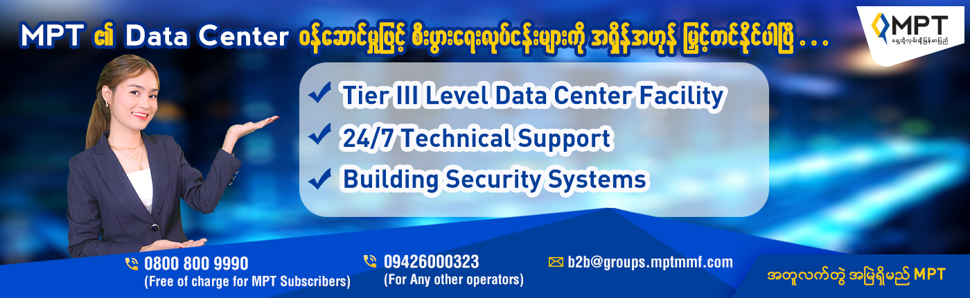 (ရန်ကုန်၊၂၀၂၄ခုနှစ်၊ ဖေဖော်ဝါရီလ ၆ ရက်)- MPT သည် “ရှေ့သို့လှမ်းချီ မြန်မာပြည်” ဟူသည့် သန္နိဌာန် နှင့်အတူ လုံခြုံစိတ်ချရသည့် နောက်ဆုံးပေါ် နိုင်ငံတကာသုံး ဆက်သွယ်ရေး နည်းပညာများကို အသုံးချ ဆောင်ရွက်နေပြီး စီးပွားရေးလုပ်ငန်းရှင်များအတွက် မိမိတို့၏ လုပ်ငန်းတိုးတက်မှုအရှိန်အဟုန်ကို MPT နှင့်အတူ မြှင့်တင်နိုင်ကြရန် ဖိတ်ခေါ်လိုက်ပါသည်။